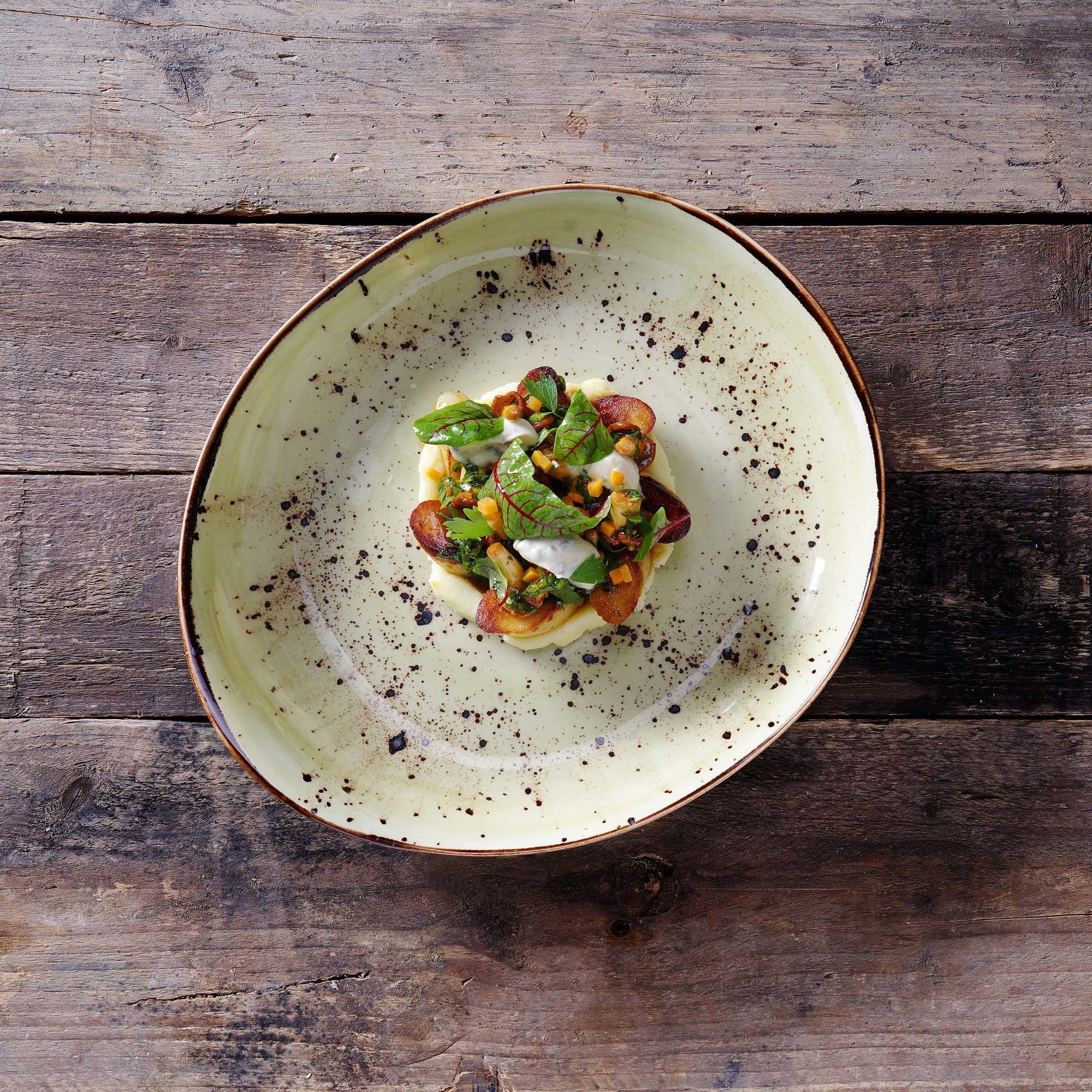 Bogata kolekcja ręcznie zdobionej porcelany w czterech soczystych kolorach. Dopasuj elementy pomarańczowe, niebieskie, szare i oliwkowe, aby uzyskać unikalny i zaskakujący wygląd stołu, a jedzenie będzie prezentować się tak samo dobrze, jak smakuje. Zastawa wytrzymała i odporna, zaprojektowana tak, aby wytrzymać trudy użycia w profesjonalnej kuchni.
