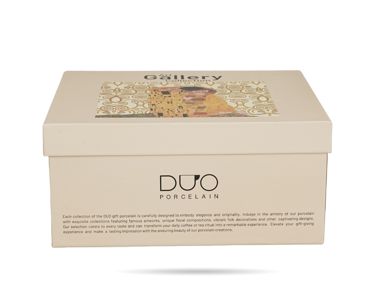 Zestaw 2 filiżanek ze spodkami Pocałunek Klimt DUO o pojemności 270 ml. Wykonane z porcelany New Bone China, zapakowane w ozdobne pudełko. Idealne na prezent - piękne, funkcjonalne i inspirowane sztuką.