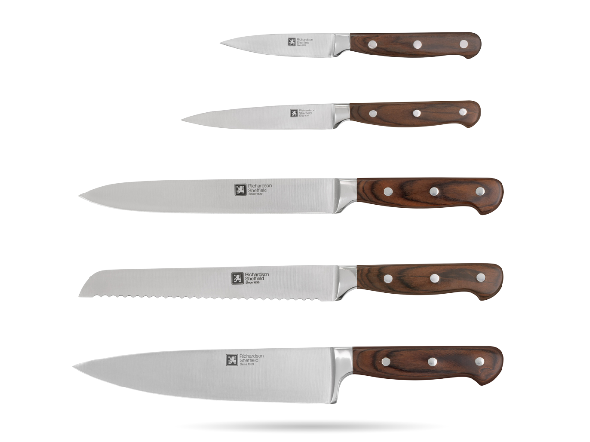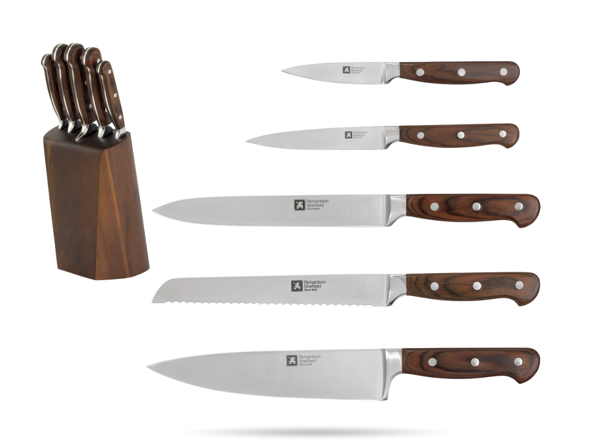 Kompletny zestaw 5 noży kuchennych Virtuose RICHARDSON SHEFFIELD w bloku z drewna akacjowego. Ostrza ze stali 5Cr15MoV i rękojeści z drewna pakka gwarantują precyzyjne cięcie, trwałość i elegancję w każdej kuchni.