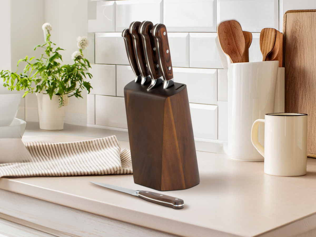 Noże wykonano z wysokogatunkowej stali 5Cr15MoV, która gwarantuje trwałość, odporność na korozję i długotrwałą ostrość. Rękojeści z drewna pakka doskonale leżą w dłoni, zapewniając stabilność i elegancki wygląd. Całość uzupełnia blok z drewna akacjowego, który nie tylko chroni ostrza, ale również stanowi stylową ozdobę kuchennego blatu.