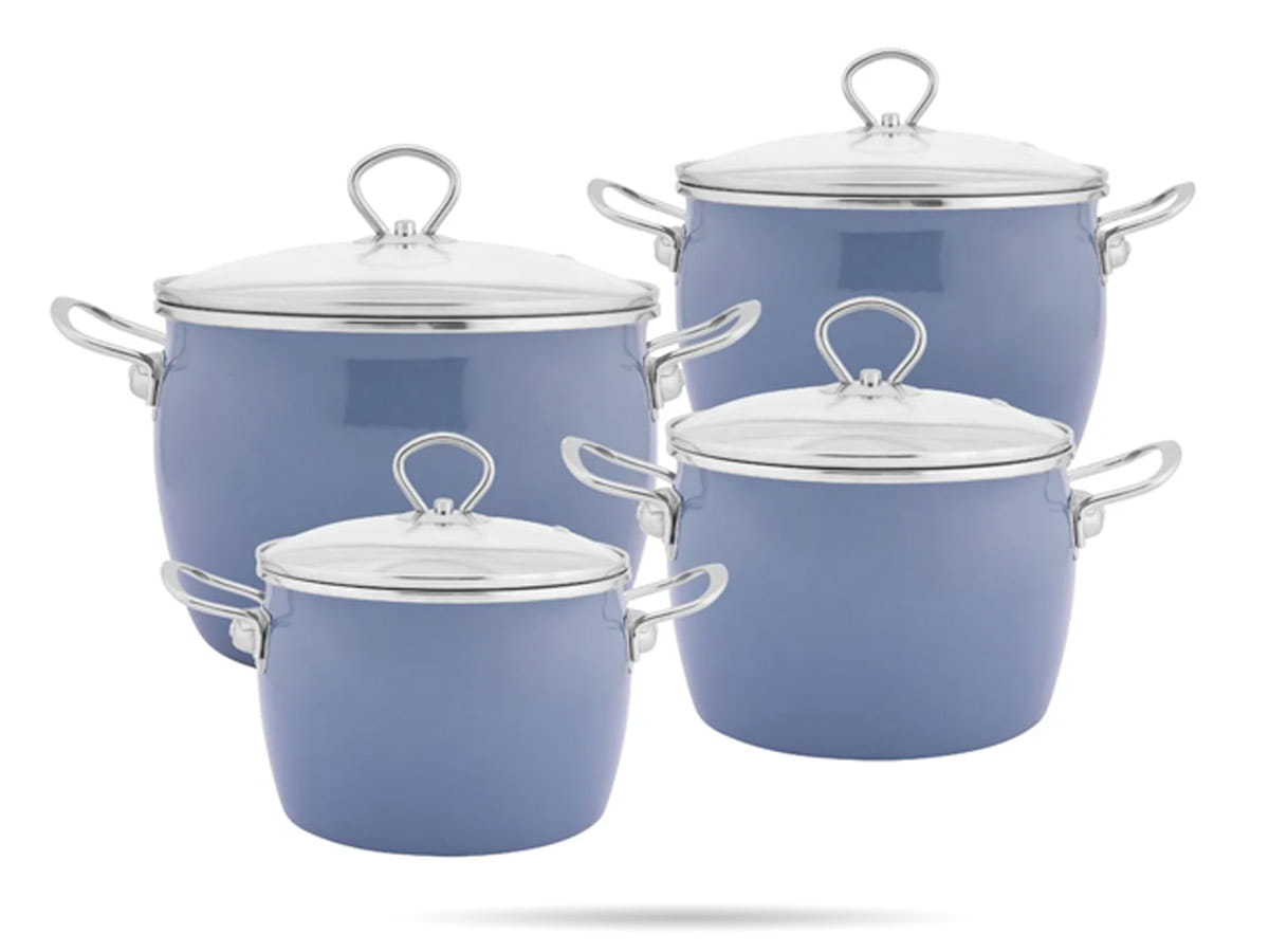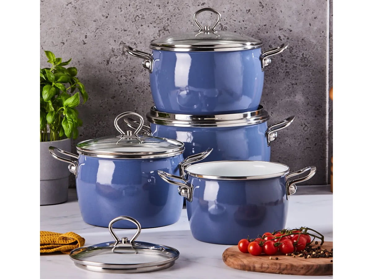Zestaw 4 garnków emaliowanych Balbina niebieskich marki ALTOM, wykonanych ze stali węglowej z podwójną warstwą emalii. Trwałe, odporne na korozję, bez niklu – idealne dla alergików. Nadają się na wszystkie rodzaje kuchenek, również indukcję.