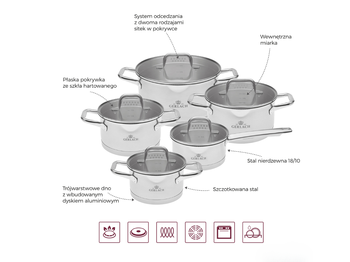 Zestaw garnków GERLACH 10 el. ze stali nierdzewnej 18/10 z trójwarstwowym dnem to trwałość i elegancja na lata. Garnki posiadają miarkę wewnętrzną, system odcedzania w pokrywkach, ergonomiczne uchwyty i nadają się do wszystkich rodzajów kuchenek, w tym indukcji. Możliwość użycia w piekarniku do 180°C oraz łatwe czyszczenie sprawiają, że to idealny komplet do nowoczesnej kuchni.