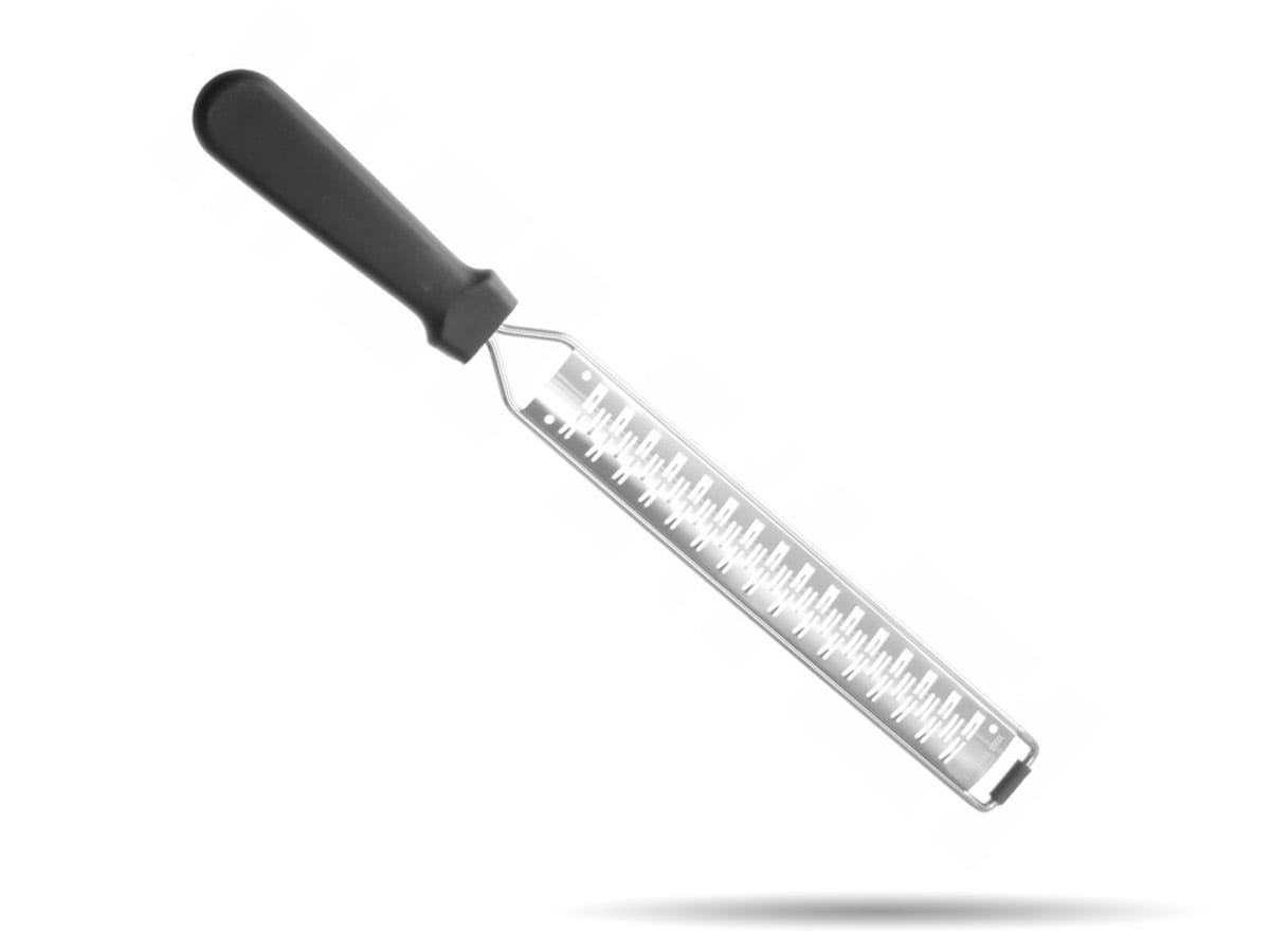 Bardzo ostra tarka laserowo ostrzona – płatki. Tarka wykonana ze stali nierdzewnej, a rączka z polipropylenu PP. Można myć w zmywarce.