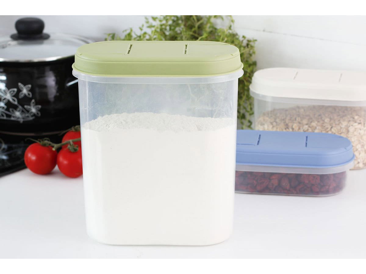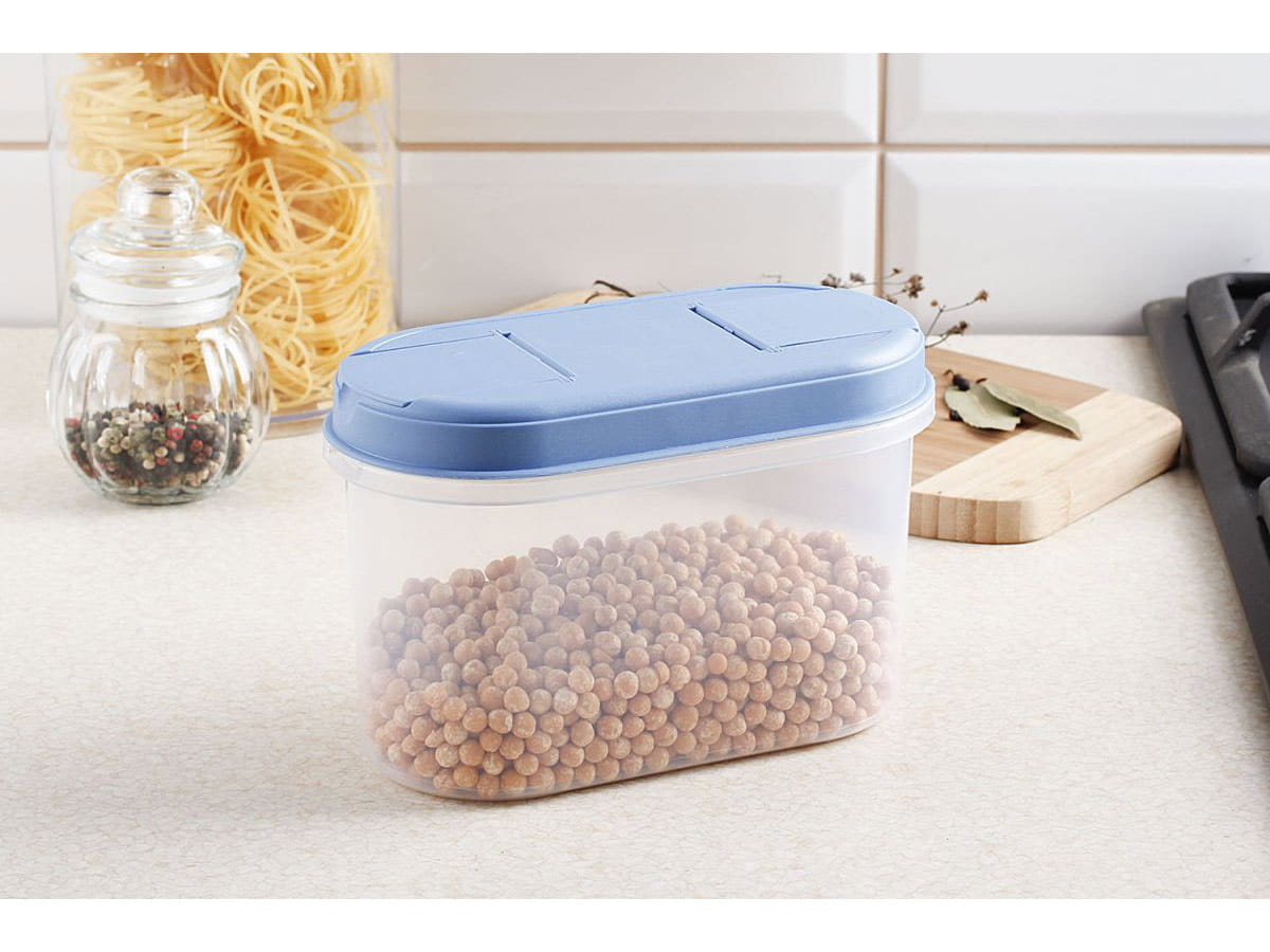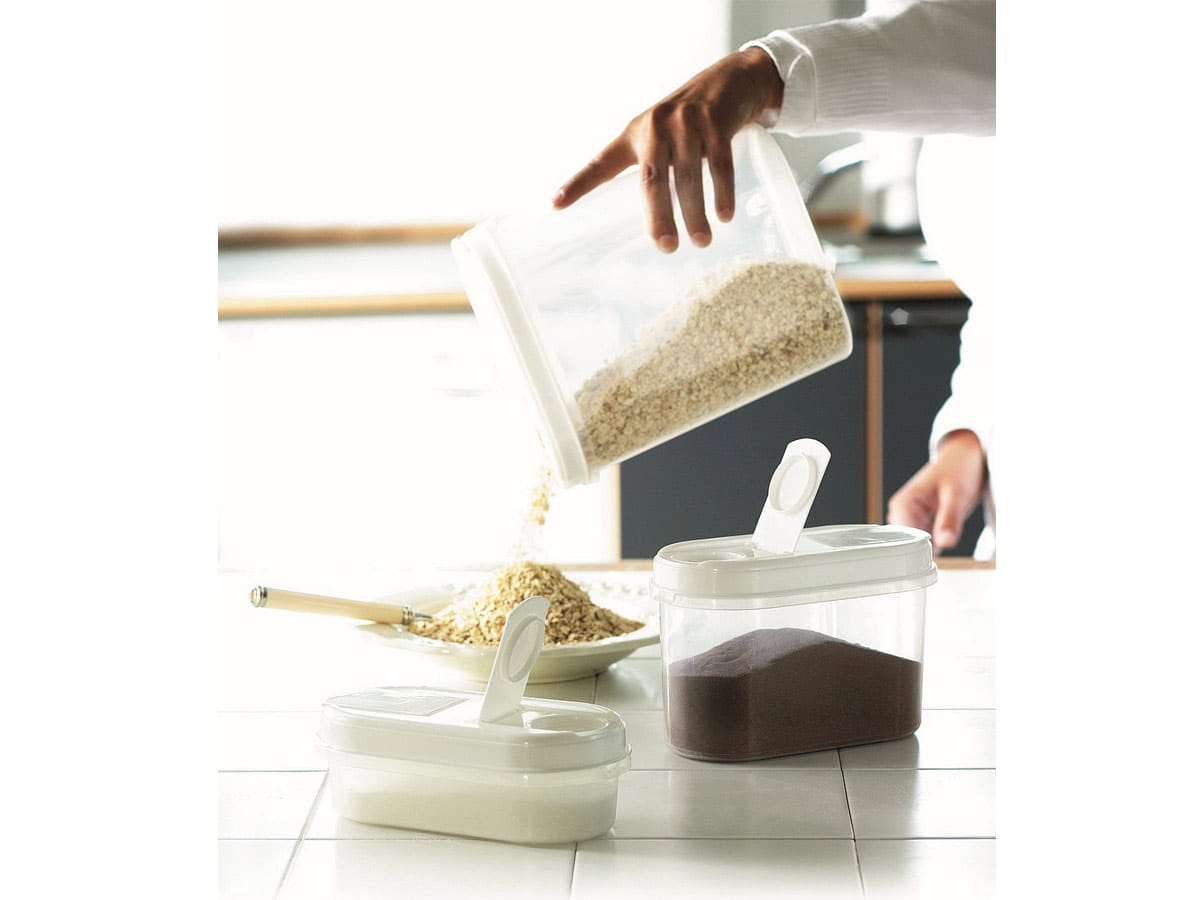 Tradycyjny pojemnik do przechowywania żywności sypkiej z dwoma dozownikami umieszczonymi w pokrywie. 2 rodzaje dozowników do zastosowania w zależności od sypkości produktu i dokładności dozowania.