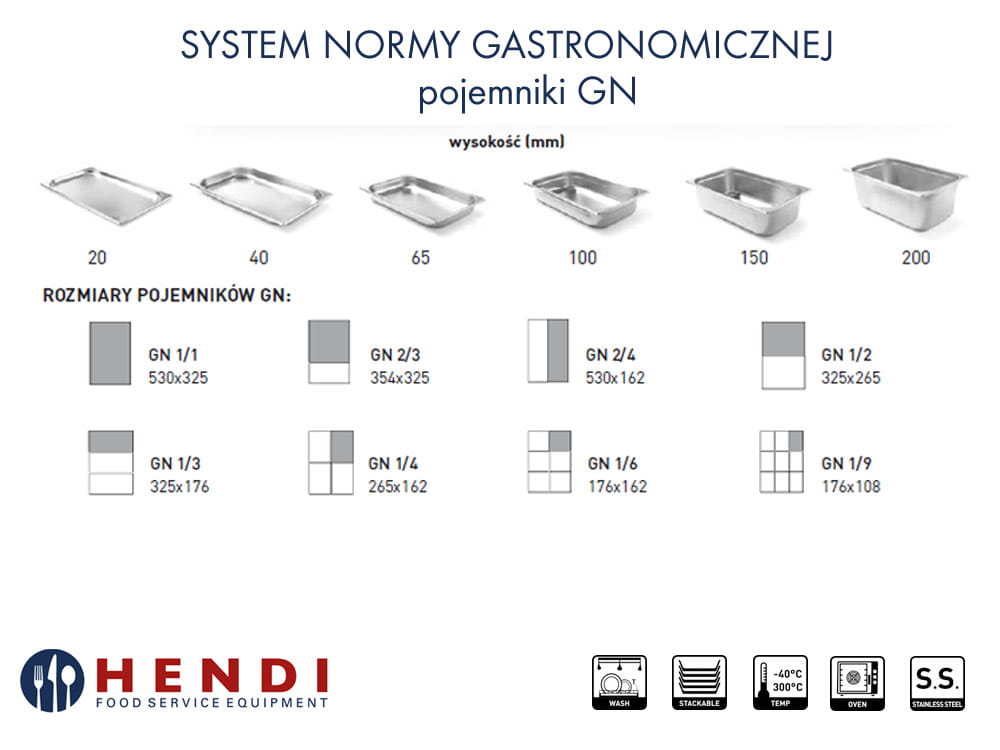 Pojemniki GN Hendi stworzono z myślą o wykorzystaniu ich w profesjonalnej gastronomii, takich jak różnego rodzaju placówki żywienia zbiorowego. Służą one do przechowywania w warunkach chłodniczych mroźniczych do -40°C. Mogą być wykorzystywane również w zakresie wyższych temperatur do +300°C. Mogą być stosowane przy piecach konwekcyjno-parowych, lodówkach, podgrzewaczach i bemarach.