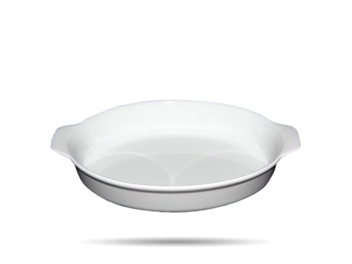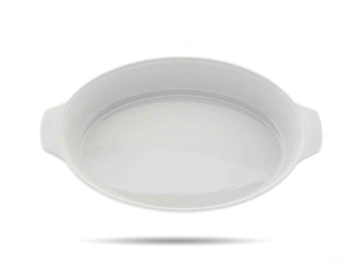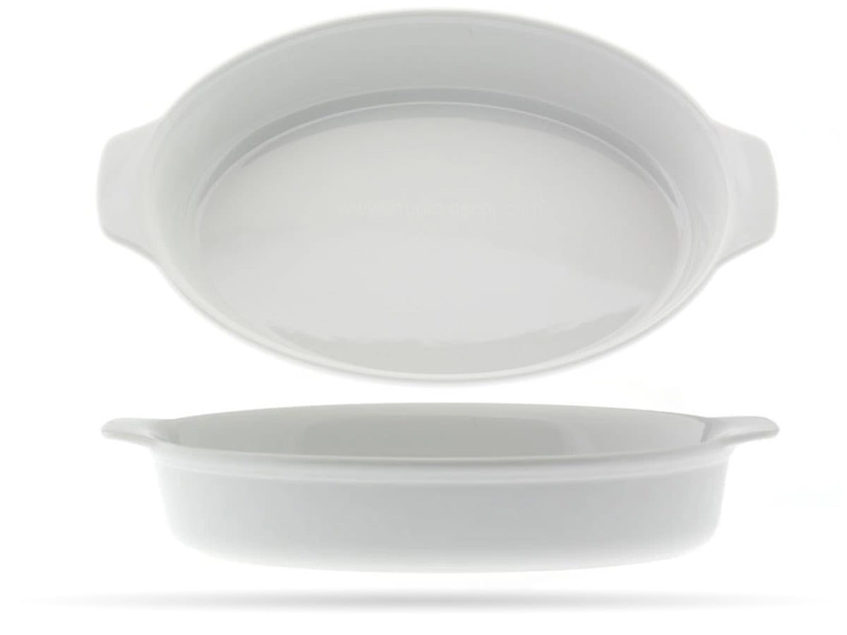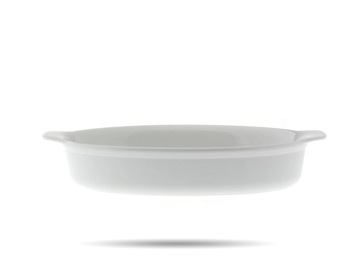 Półmisek owalny do zapiekania LUBIANA. Można myć w zmywarkach, stosować w piekarnikach i kuchenkach mikrofalowych.