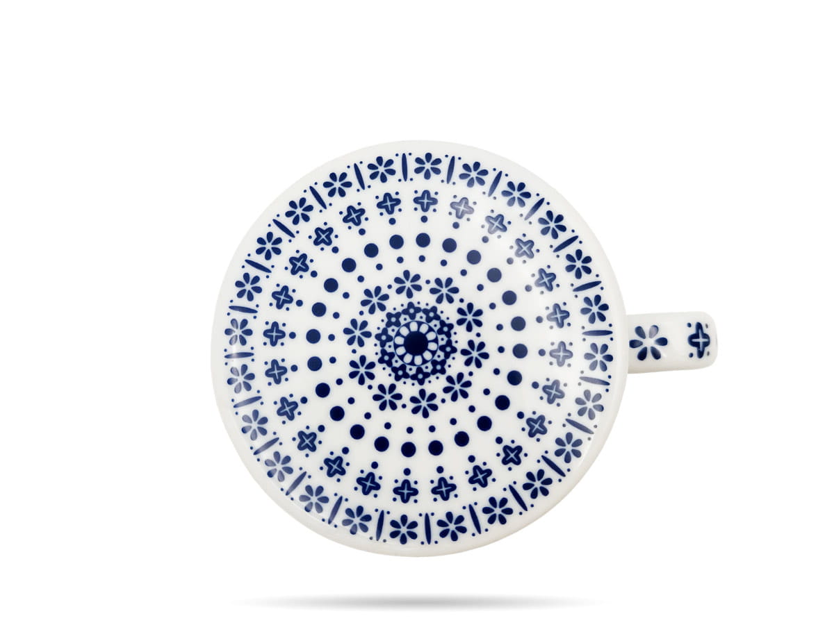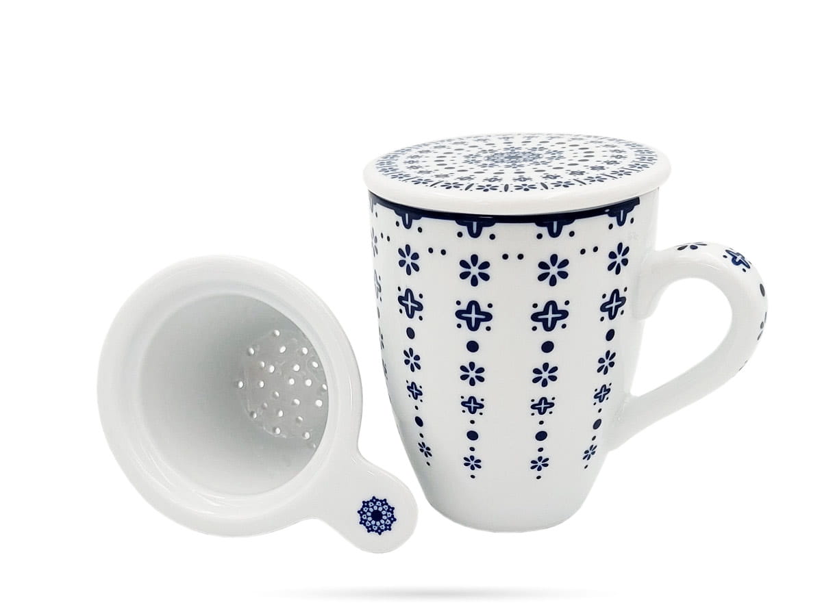 Zestaw Flisty Bogucice to biała porcelana z niebieskim, folklorystycznym wzorem. Kubek wykonano z grubej, solidnie szkliwionej porcelany. Dopasowana pokrywka ułatwi zaparzanie ulubionego naparu i na dłużej utrzyma ciepło.