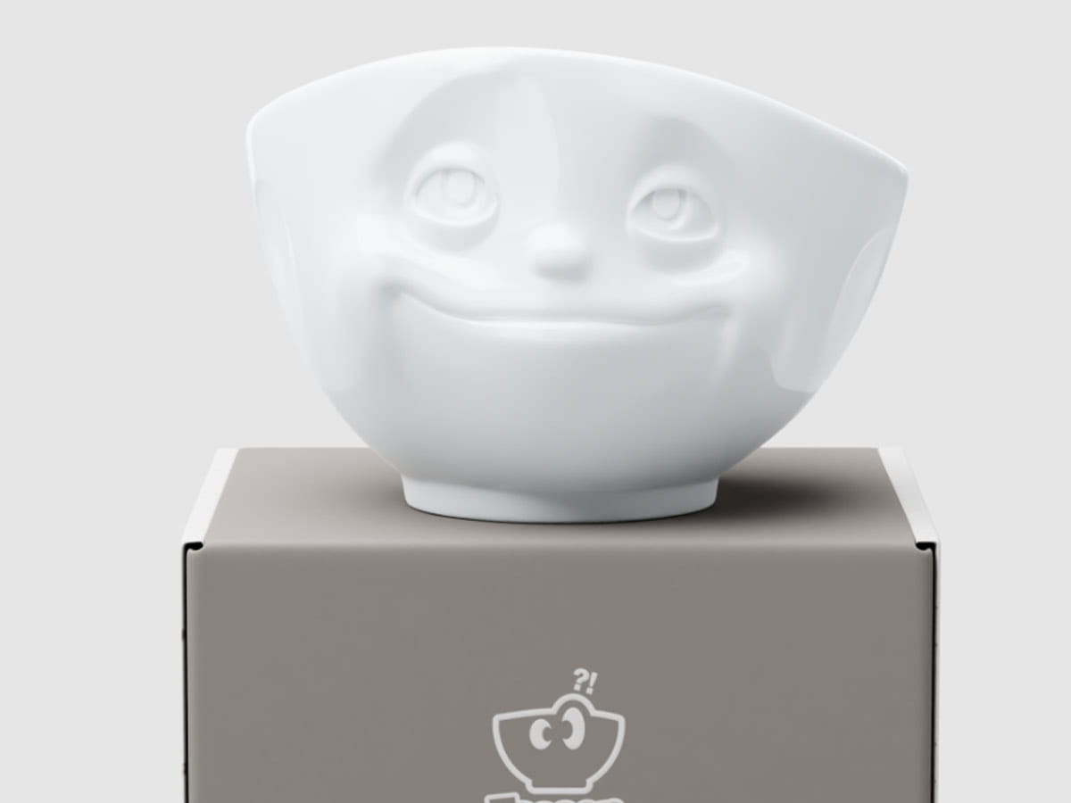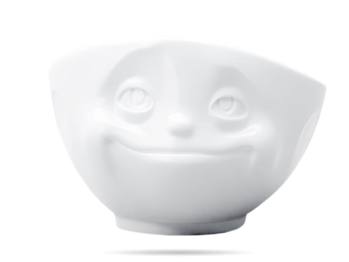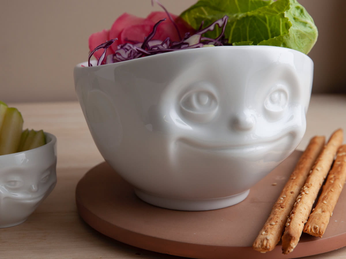 Rozmarzona salaterka 58Products. Porcelanowa miseczka do sałatek, zup czy płatków śniadaniowych. Tassen to linia naczyń z zabawnymi, wypukłymi buźkami. Oryginalny pomysł na prezent.