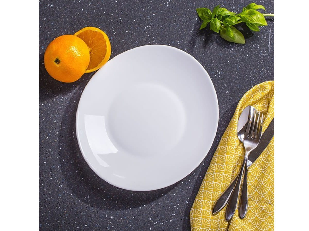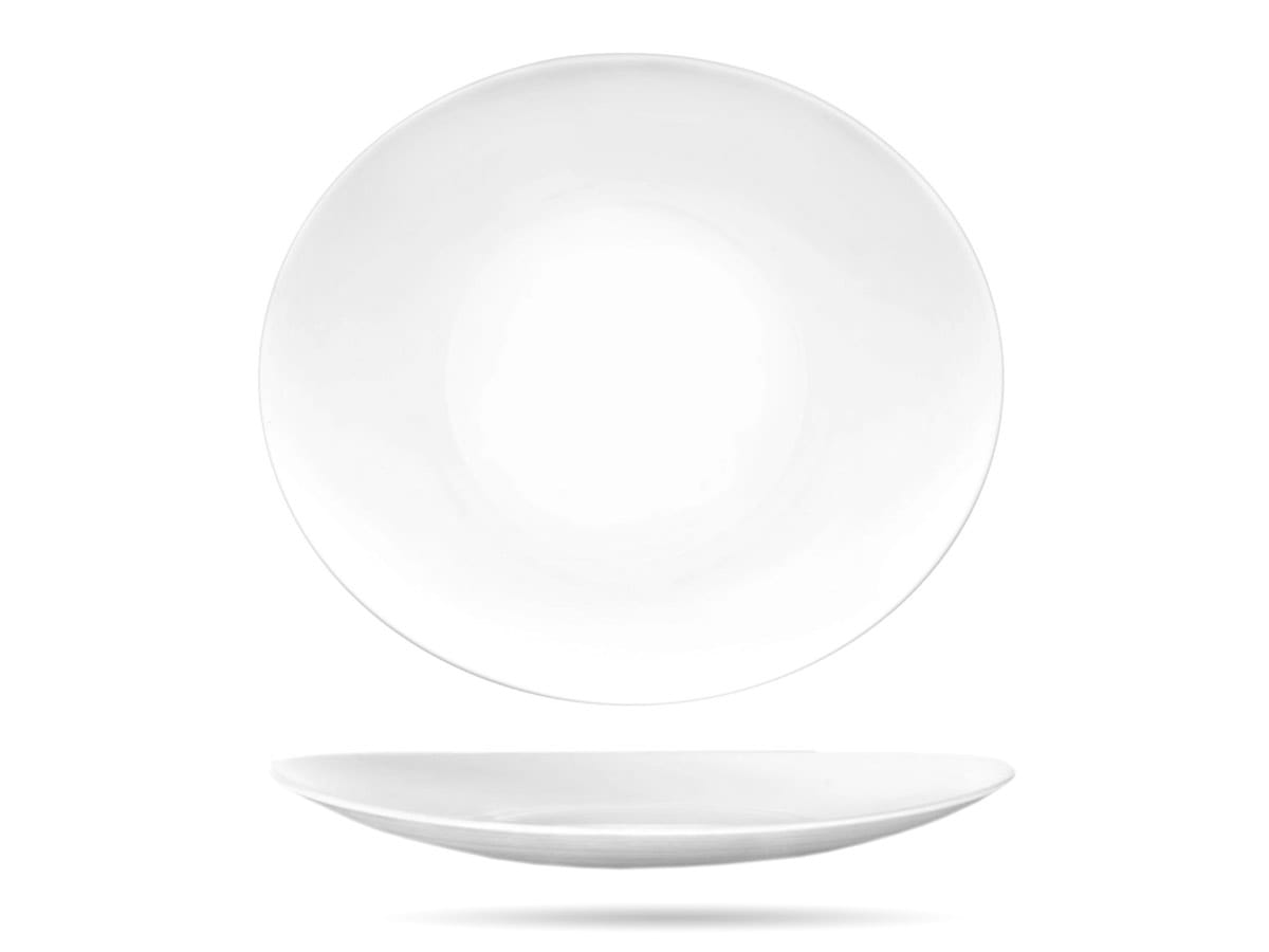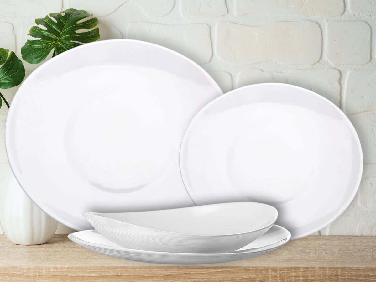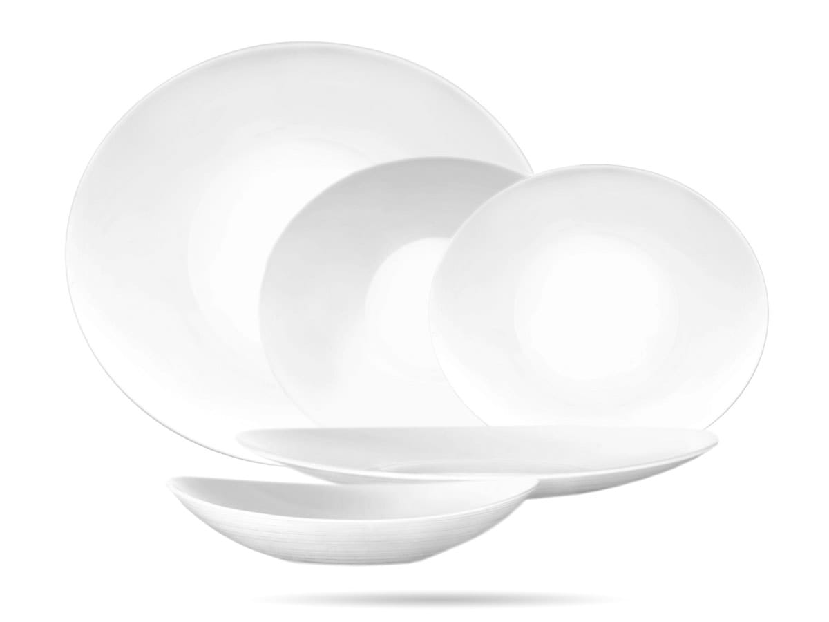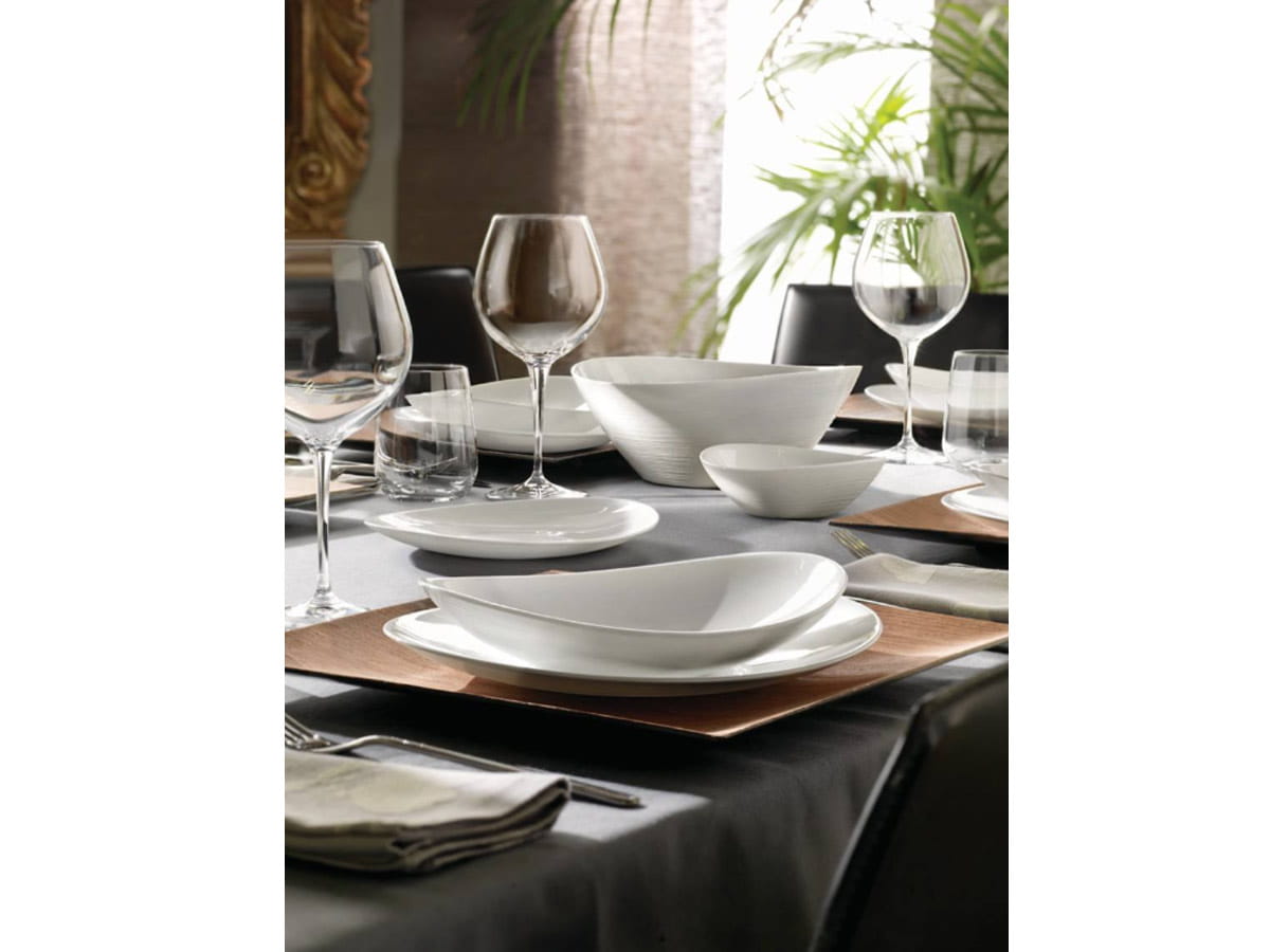 Serwis obiadowy Prometeo Bormioli Rocco. Serwis obiadowy dla 4 osób 12 elementy. Białe talerze w owalnym kształcie, zdobione falistym wzorem na zewnętrznej stronie. Zestaw naczyń, na którym podasz różnego rodzaju dania: dania główne, zupy czy desery.