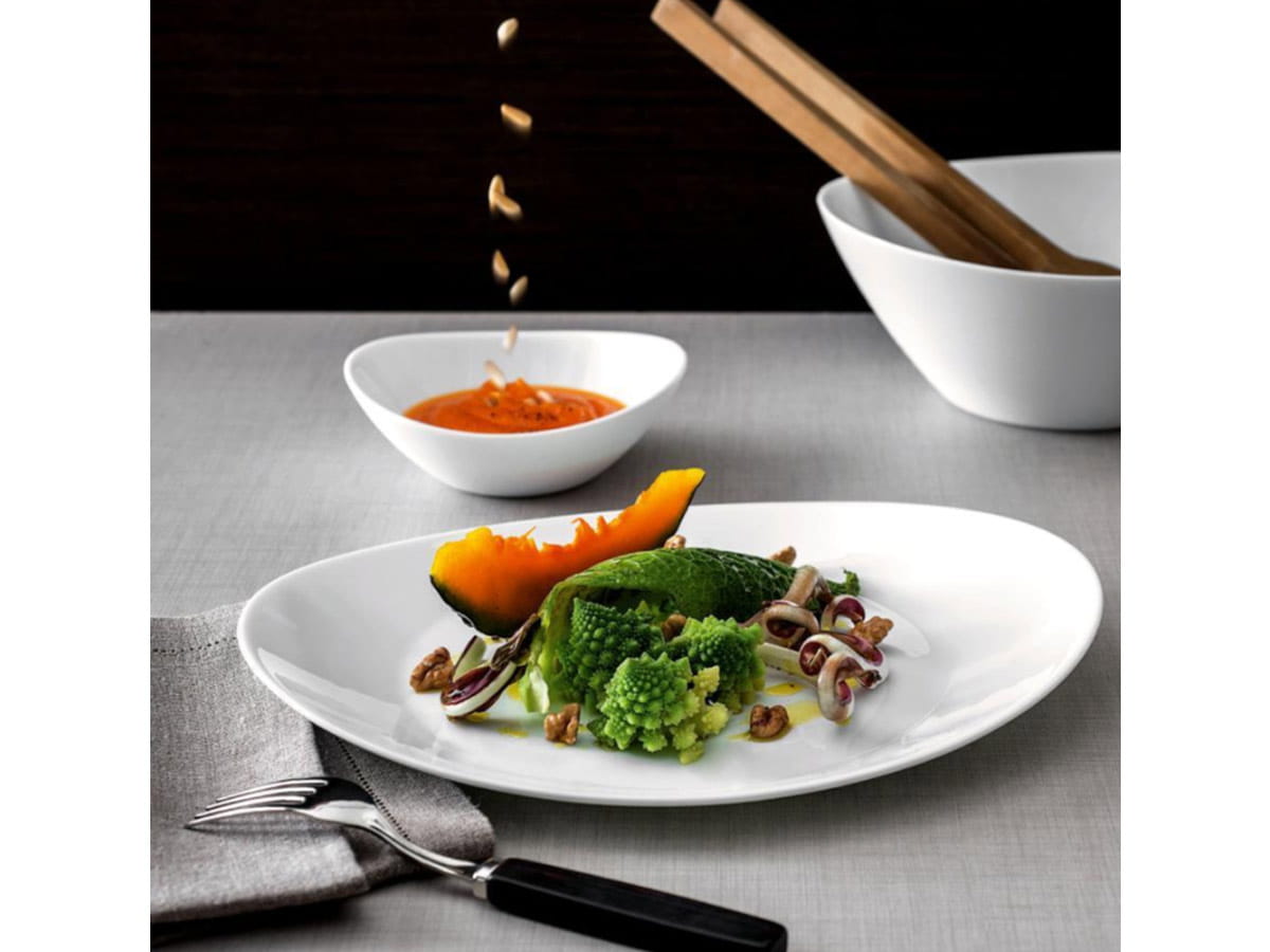 Prometeo to talerze w owalnym kształcie z nieregularnym, falistym zdobieniem na zewnętrznej stronie. Ciekawy design - wytłaczane boki tworzą efekt płynącej fali - dodaje świeżości i ciekawie wyeksponuje serwowane dania. Komplet zawiera talerze deserowe, obiadowe płytkie i głębokie - podasz na nich każdego rodzaju dania. Jeden zestaw - wiele korzyści.