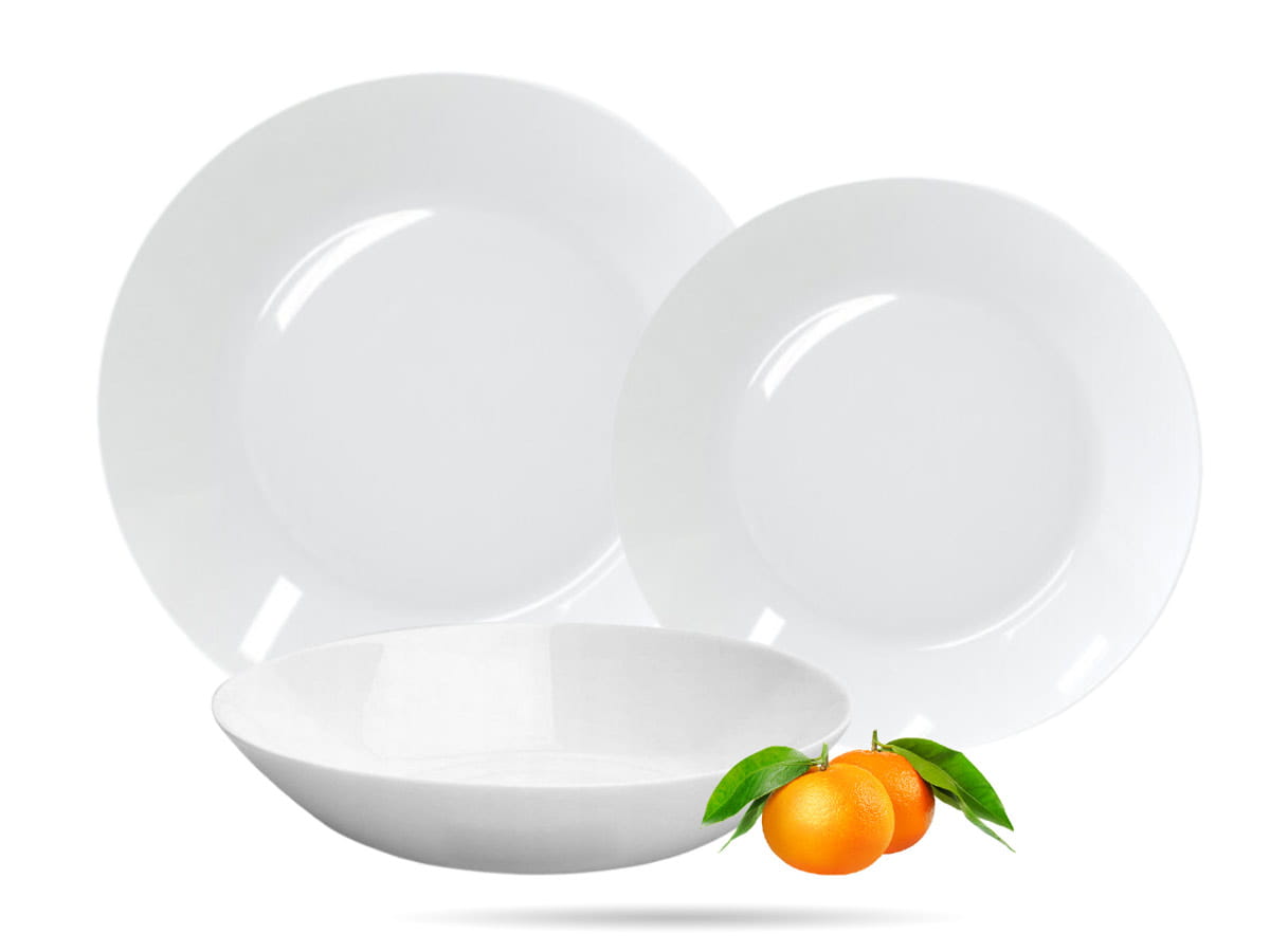 Serwis obiadowy Zelie Arcopal Luminarc. Zestaw talerzy, na których podasz główne dania obiadowe, śniadania, kolacje i desery. Białe talerze, lekkie i mocne, wykonane ze szkła hartowanego. Seria występuje w białej i czarnej wersji kolorystycznej, dostępne są u nas talerze na sztuki lub w formie gotowych serwisów.