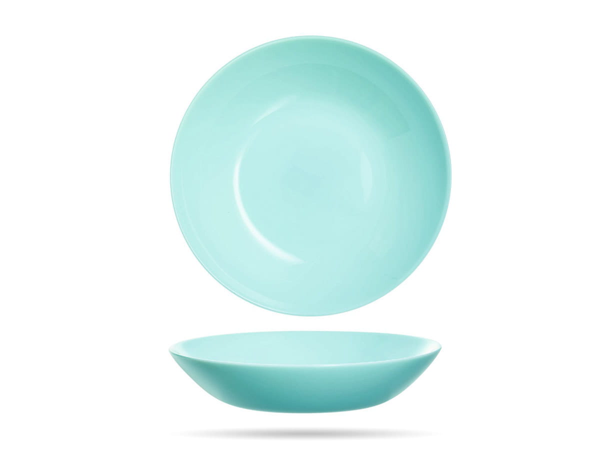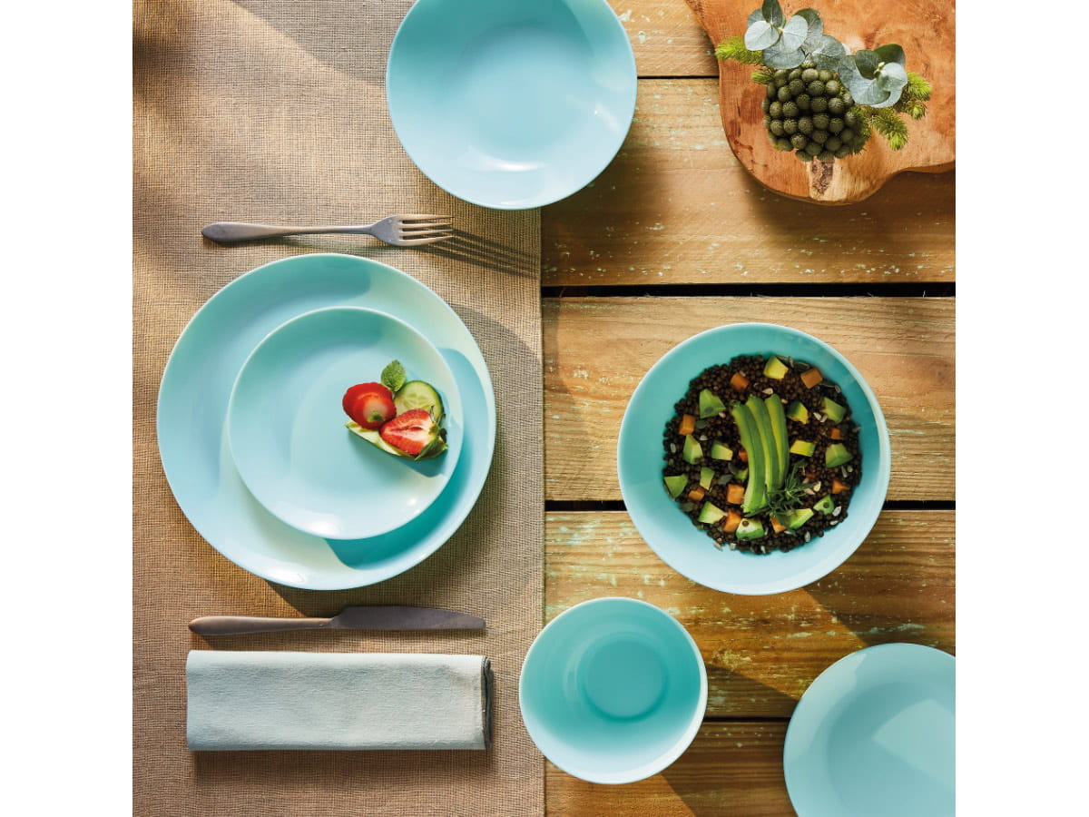 Serwis obiadowy Diwali Luminarc. Serwis obiadowy dla 6 osób 18 elementów. Gładkie, turkusowe naczynia ze szkła hartowanego - lekkie i mocne. Zestaw naczyń, na którym podasz różnego rodzaju dania: dania główne, zupy, desery.