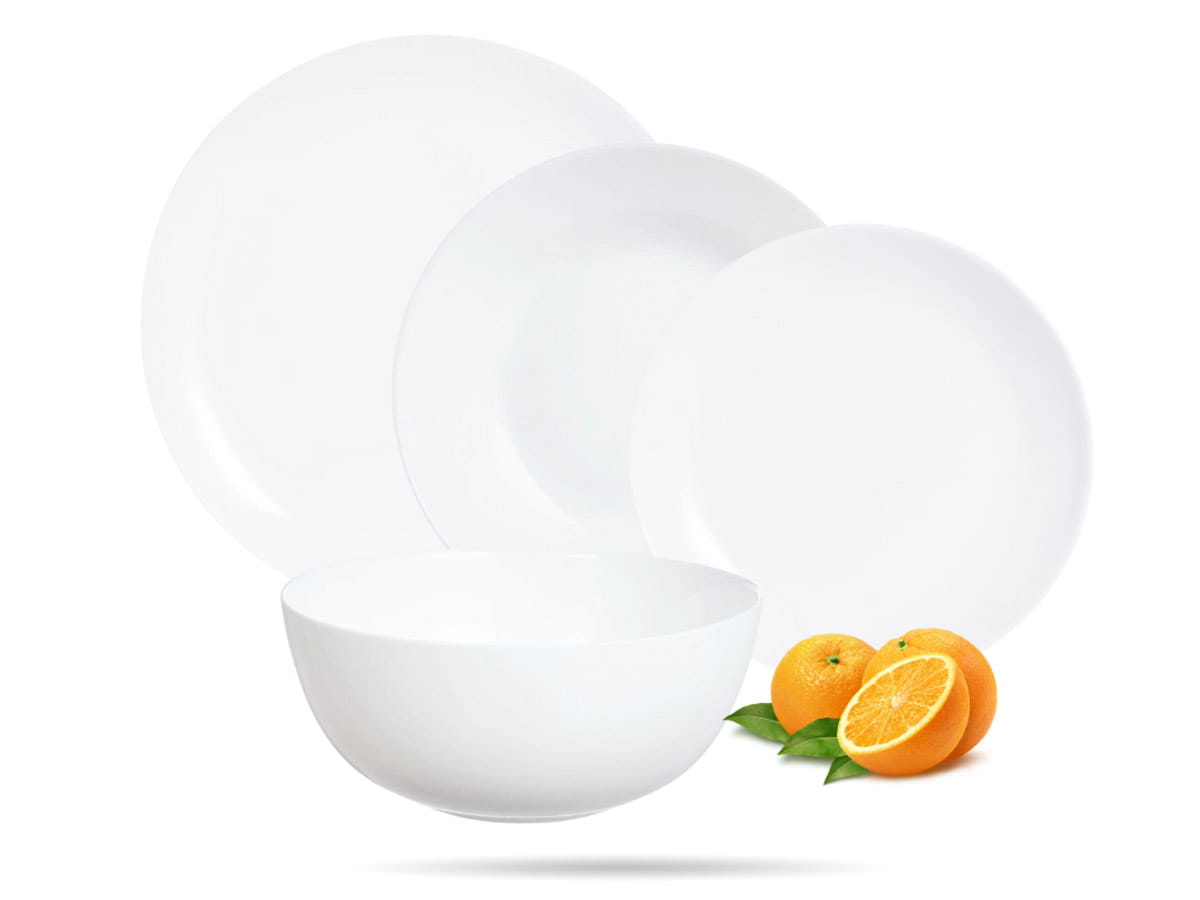 Serwis obiadowy Diwali Luminarc. Serwis obiadowy z dużą salaterką dla 6 osób 19 elementów. Diwali wniesie powiew świeżości do domowej zastawy stołowej. Gładkie, białe talerze ze szkła hartowanego - lekkie i mocne. Zestaw naczyń, na którym podasz różnego rodzaju dania: dania główne, zupy czy desery.