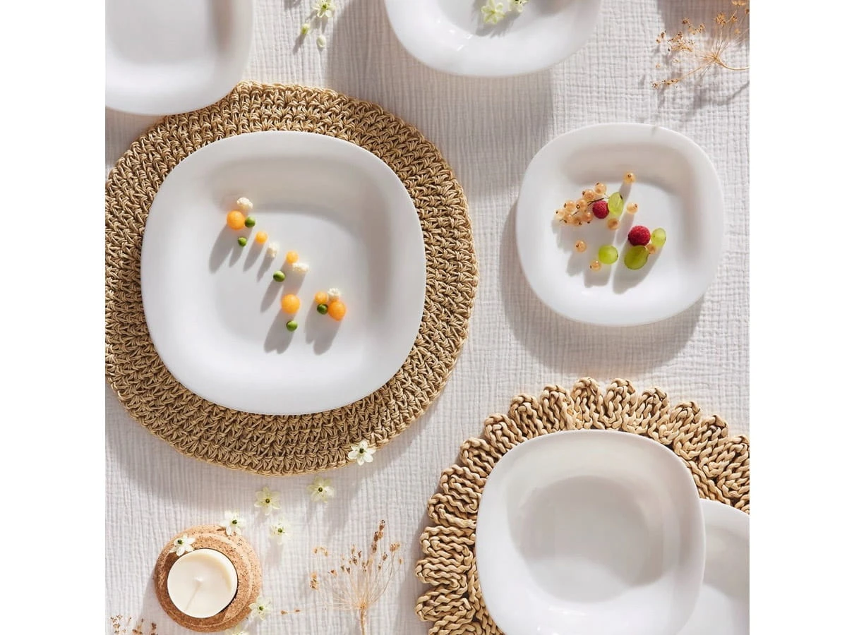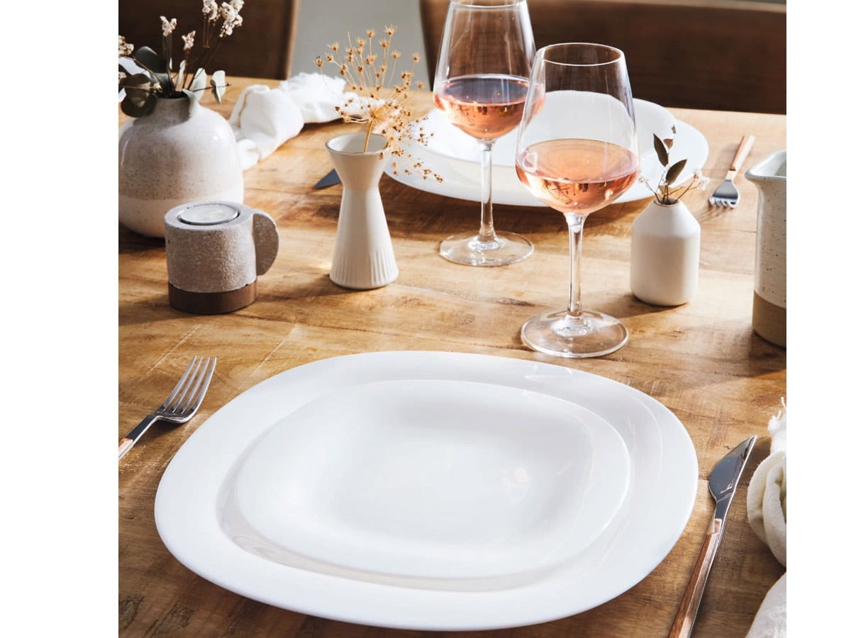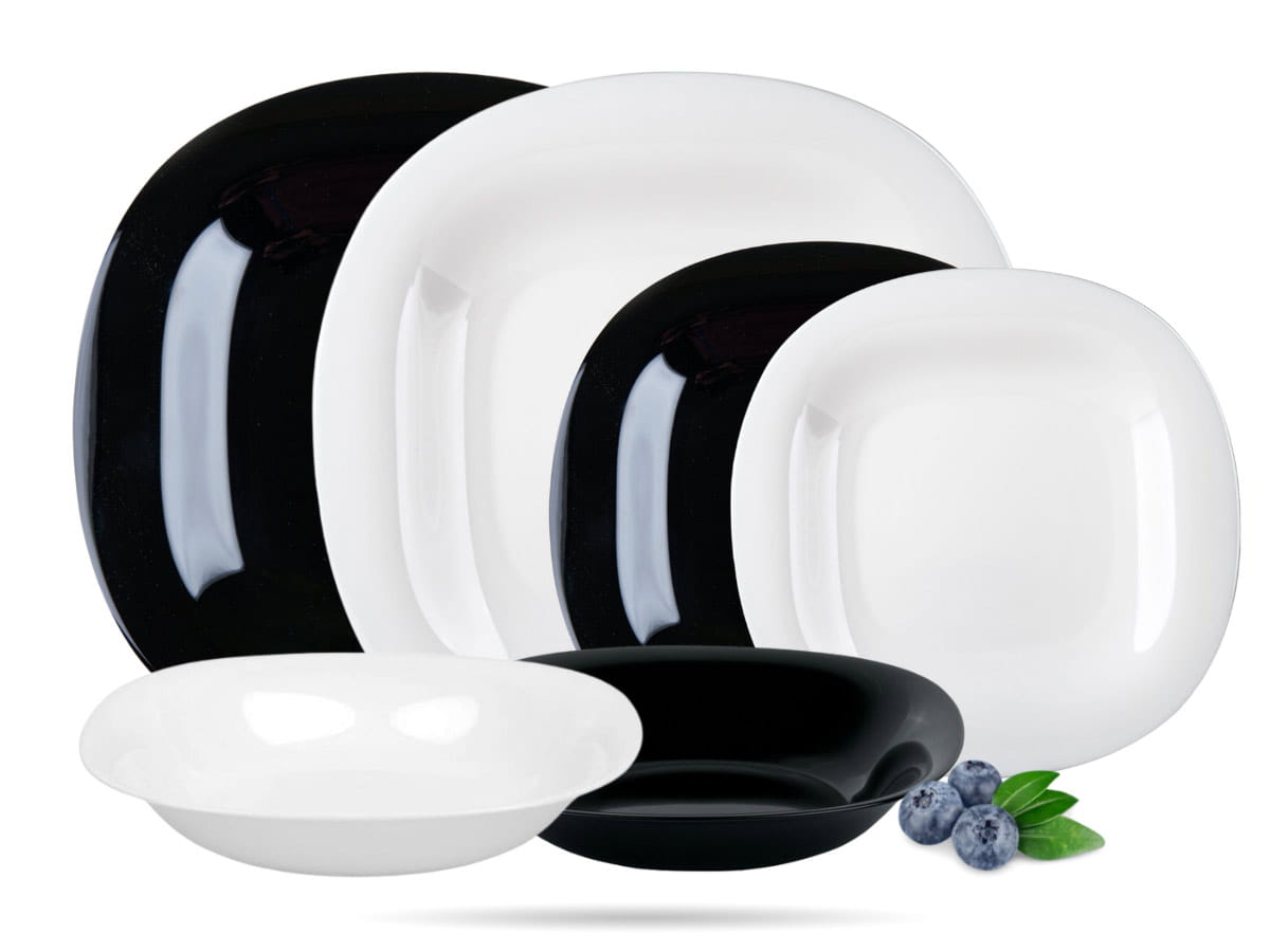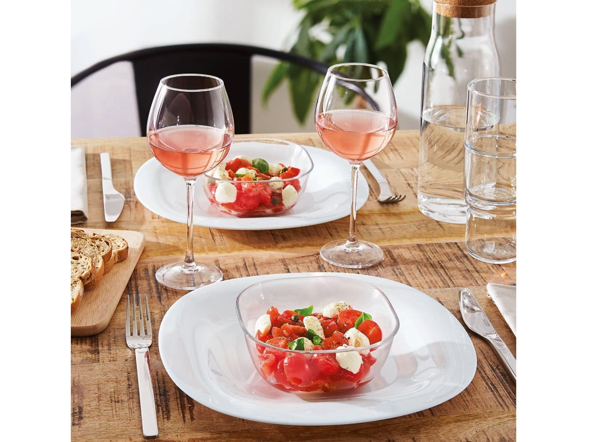 Carine Luminarc to mocne i lekkie naczynia bez zdobień, w kształcie zaokrąglonego kwadratu. Zestaw zawiera talerze deserowe, obiadowe płytkie i głębokie.
