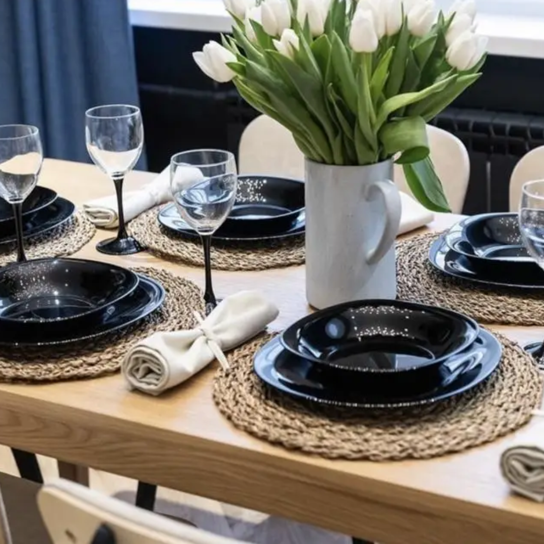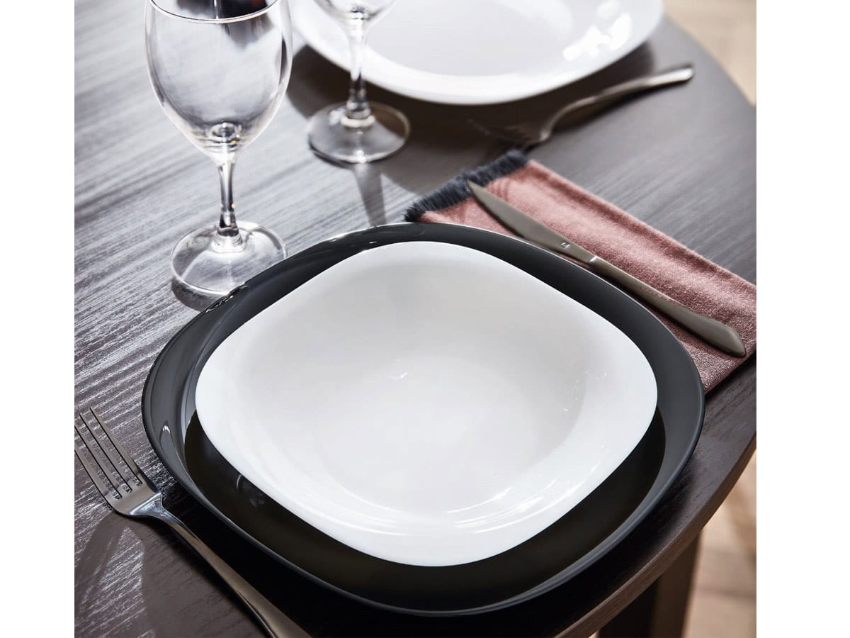 Carine Luminarc to mocne i lekkie naczynia bez zdobień, w kształcie zaokrąglonego kwadratu. Zestaw zawiera talerze deserowe, obiadowe płytkie i głębokie oraz salaterkę.
