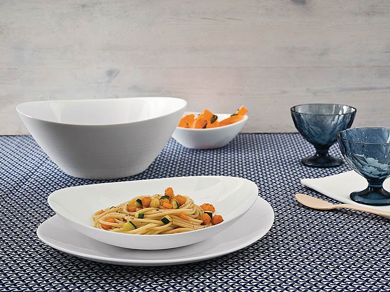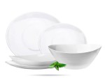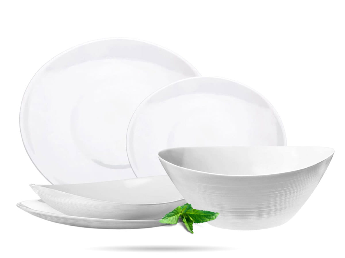 Serwis obiadowy Prometeo Bormioli Rocco. Serwis obiadowy z salaterką, dla 6 osób 18 elementów. Białe naczynia w ciekawym, owalnym kształcie, zdobione wypukłą linią na zewnątrz. Mocne i lekkie, wykonane ze szkła hartowanego. Zestaw naczyń, na którym podasz różnego rodzaju dania: dania główne, zupy, desery i sałatki.