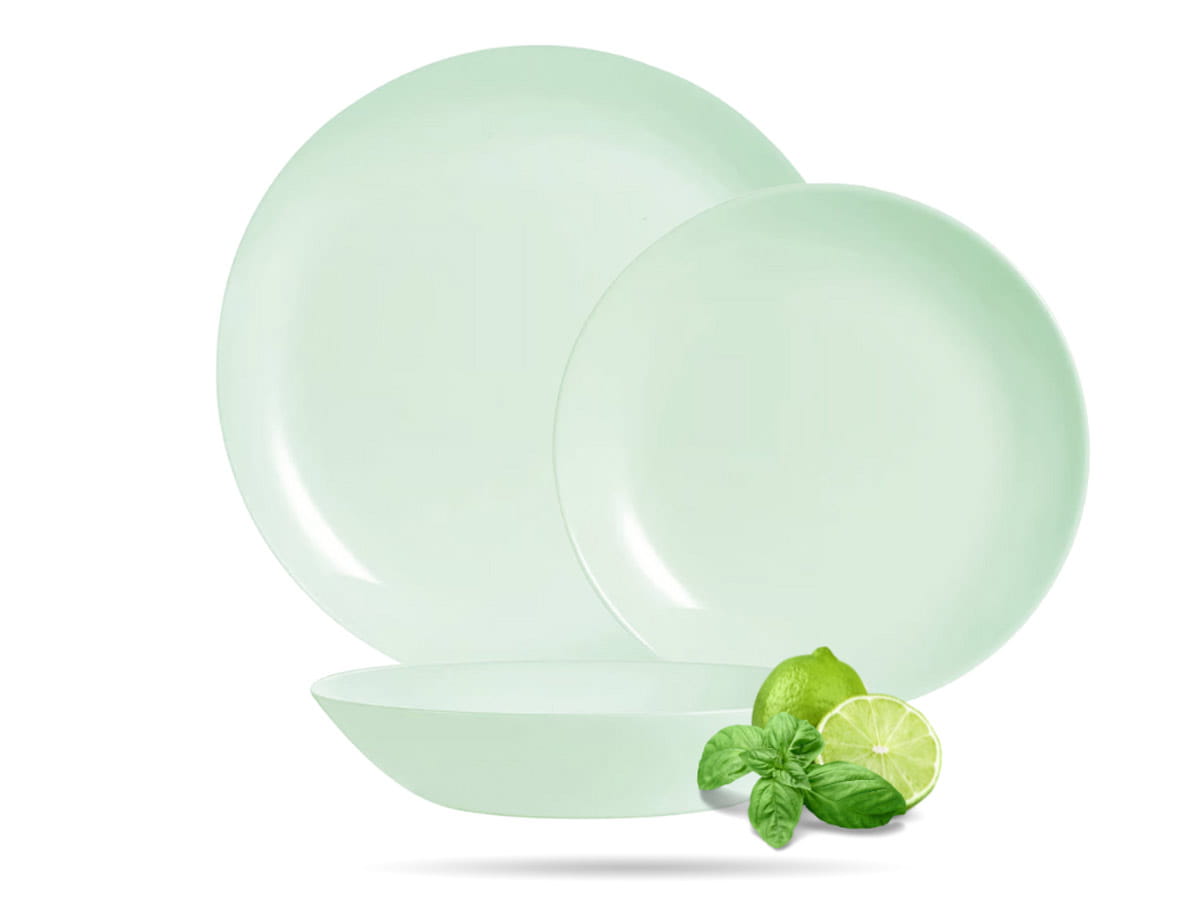 Serwis obiadowy Diwali Luminarc. Serwis obiadowy dla 6 osób 18 elementów. Paradise Green wniesie powiew świeżości do domowej zastawy stołowej. Gładkie, jasno zielone talerze ze szkła hartowanego - lekkie i mocne. Zestaw naczyń, na którym podasz różnego rodzaju dania: dania główne, zupy czy desery.