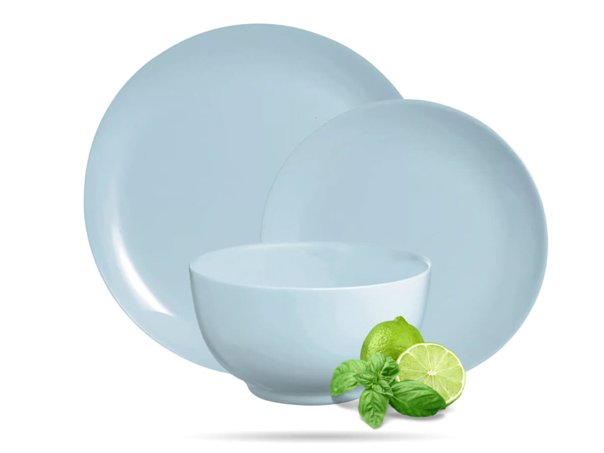 Serwis obiadowy Diwali Luminarc. Serwis obiadowy z salaterką dla 4 osób 12 elementów niebieski Paradise Blue Diwali LUMINARC. Gładkie, jasno niebieskie talerze ze szkła hartowanego w zestawie z miseczkami - kompletny zestaw naczyń, na którym podasz różnego rodzaju dania: dania główne, zupy czy desery.