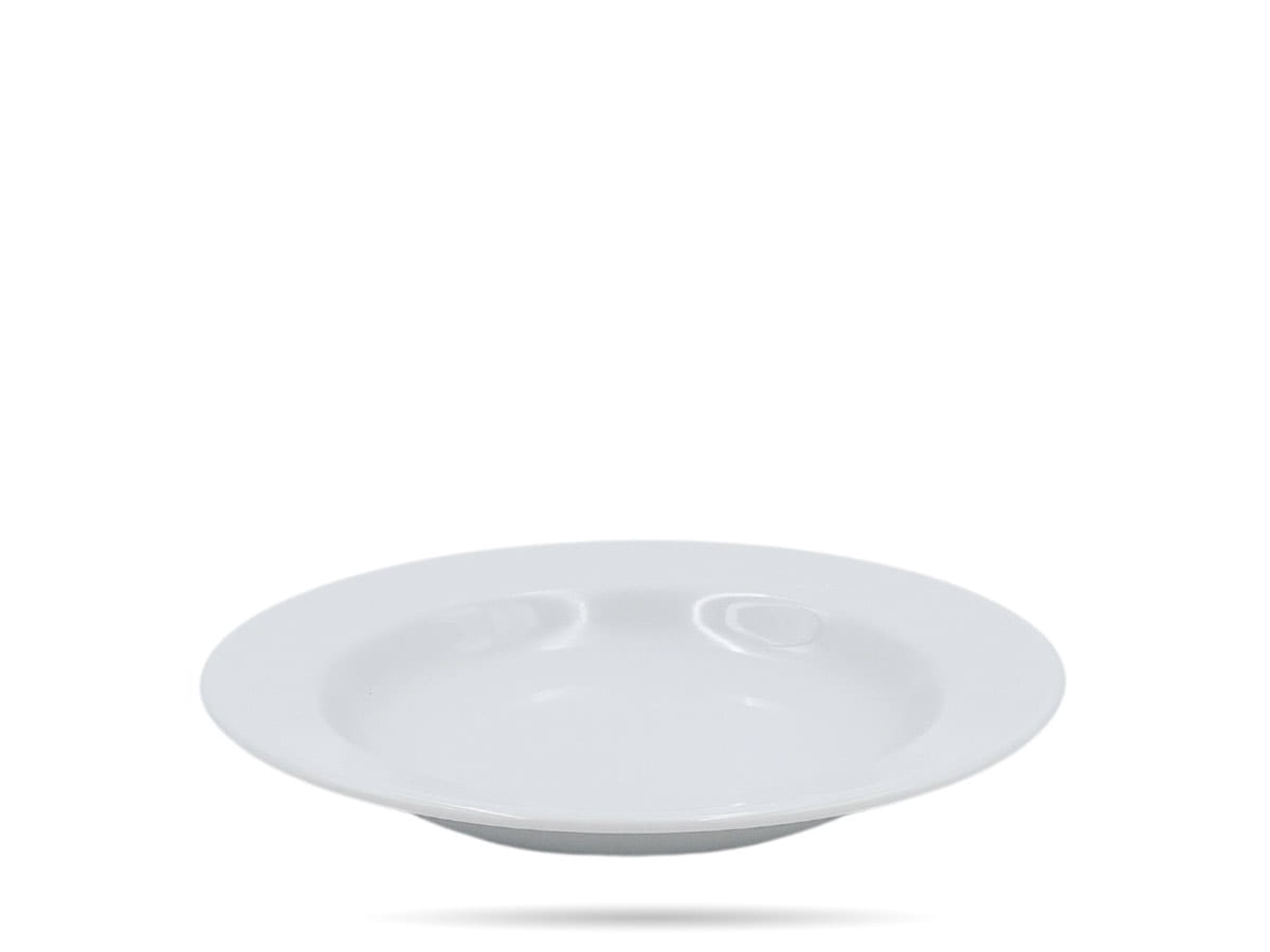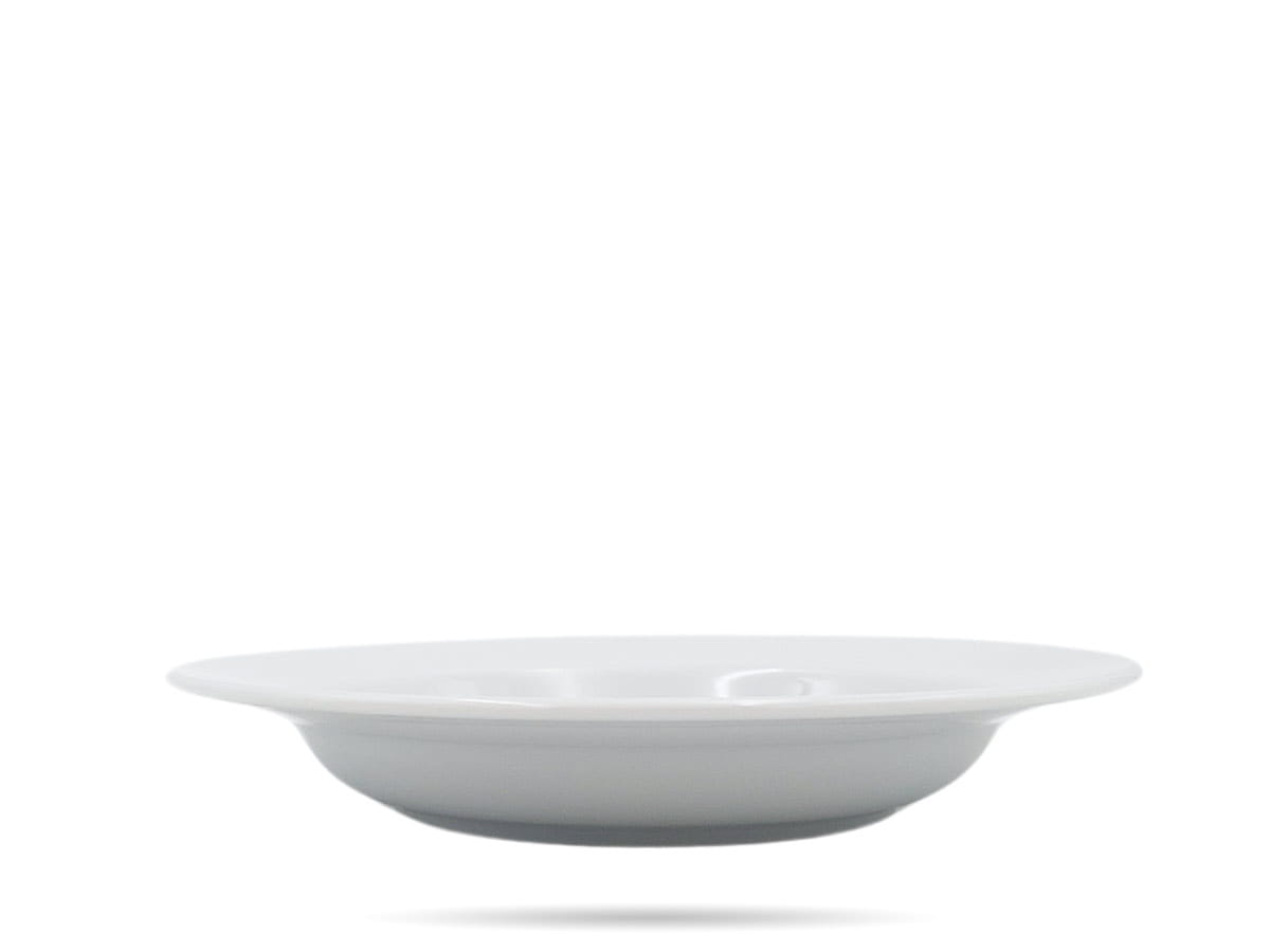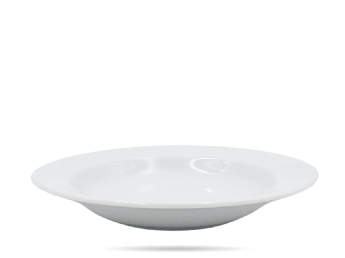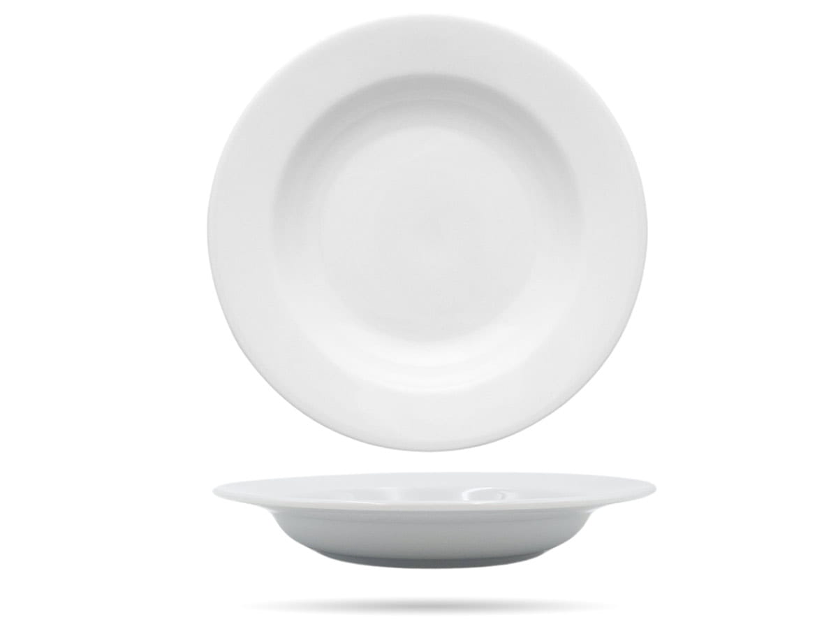 Biały talerz głęboki. Gładki, solidnie, szkliwiony, ze wzmocnionymi brzegami. Sprawdzi się jako talerz do zup, kasz, kremów, ryżu i wielu innych dań.