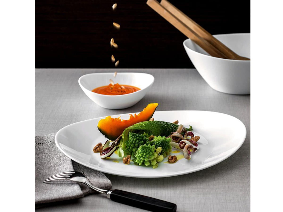 Prometeo to talerze w owalnym kształcie z nieregularnym, falistym zdobieniem na zewnętrznej stronie. Ciekawy design - wytłaczane boki tworzą efekt płynącej fali - dodaje świeżości i ciekawie wyeksponuje serwowane dania.