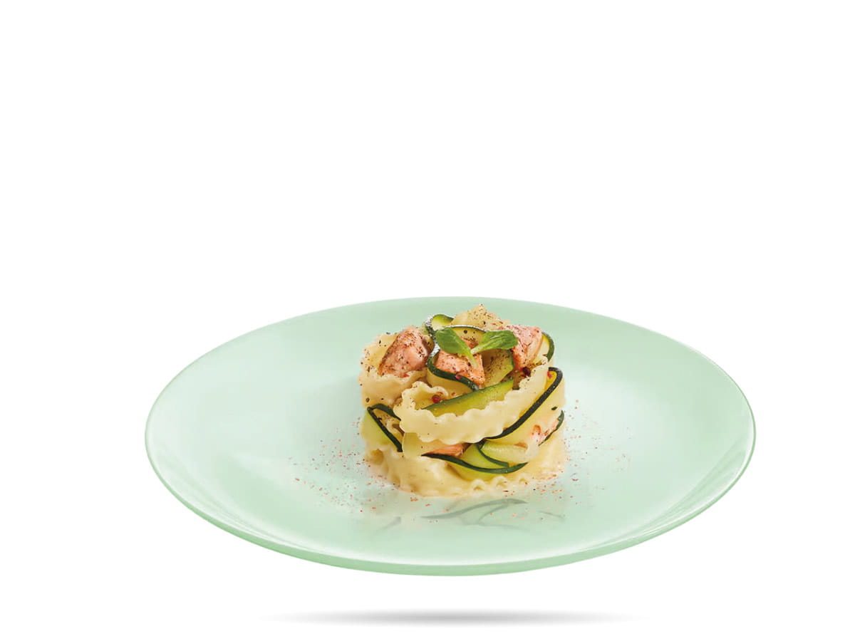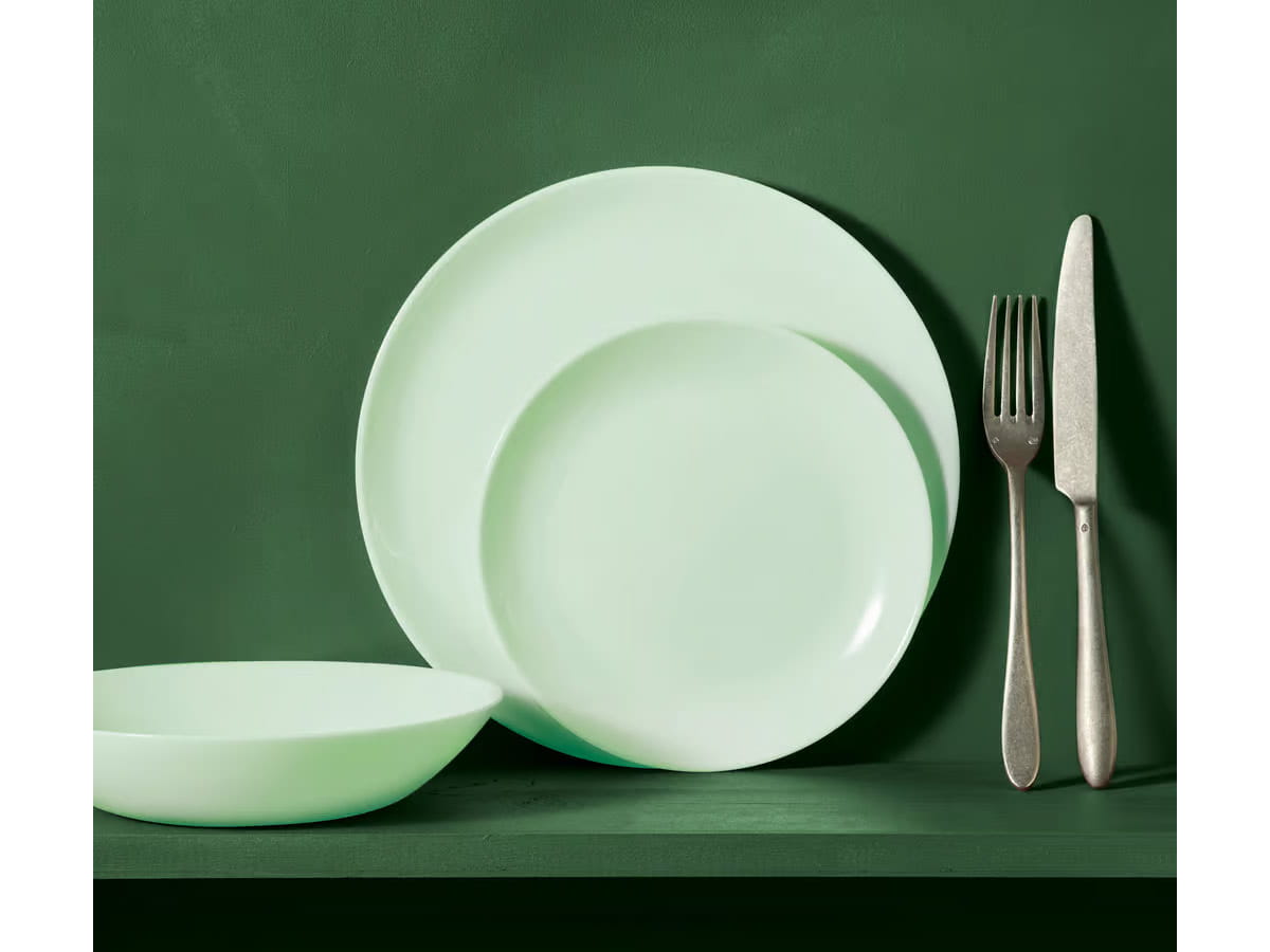 Talerz obiadowy Diwali Luminarc. Duży, płytki talerz do dań głównych. Gładki, jasno zielony talerz ze szkła hartowanego - trwały i odporny na uszkodzenia. Można bezpiecznie myć w zmywarce.