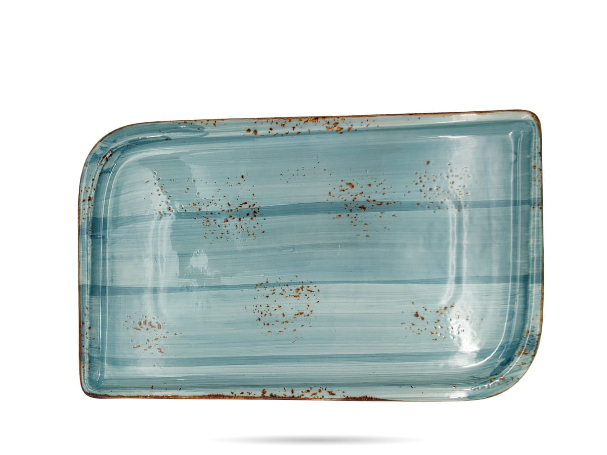 Oryginalny, prostokątny talerz w kolorze niebieskim, firmy By Bone. Głębia koloru i motyw malowniczej spirali wewnątrz talerza sprawia, że talerz prezentuje się nietuzinkowo. Seria doskonale sprawdzi się w profesjonalnej gastronomii. Może być także oryginalnym uzupełnieniem domowej zastawy.