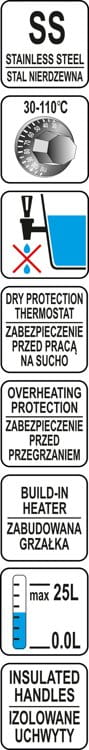 Wysoka jakość wykończenia połączona jest z niezawodnością wynikającą z użycia bardzo wydajnych grzałek oraz specjalnemu systemowi zabezpieczeń. Grzałka o mocy 3000W znajduje się pod dnem warnika. Takie rozwiązanie posiada szereg zalet. Najważniejszy jest brak kontaktu z wodą, dzięki czemu nie tworzy się na niej kamień, który z czasem może doprowadzić do przegrzania i do awarii. Bardzo Istotna jest także możliwość łatwego czyszczenia pojemnika i jego odkamieniania. Dodatkowo zastosowane zabezpieczenia przeciw przegrzaniu się oraz przed pracą na sucho znacznie wydłużają żywotność urządzenia.