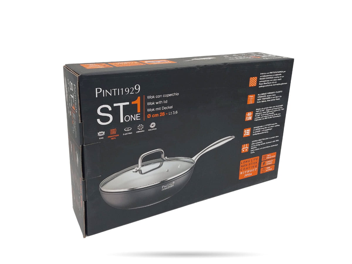 Patelnia gastronomiczna typu WOK włoskiej marki Pinti1929. Głęboka patelnia, która spełni oczekiwania każdego szefa kuchni, sprawdzi się w branży cateringowej i gastronomicznej. Nieprzywierająca powłoka, wysoka odporność na ścieranie, uchwyt ze stali nierdzewnej, pełna indukcja - patelnia na indukcję, kuchnię gazową, ceramiczną i elektryczną. Średnica 28 cm. Długość 49 cm. Wysokość bez pokrywy 8 cm.
