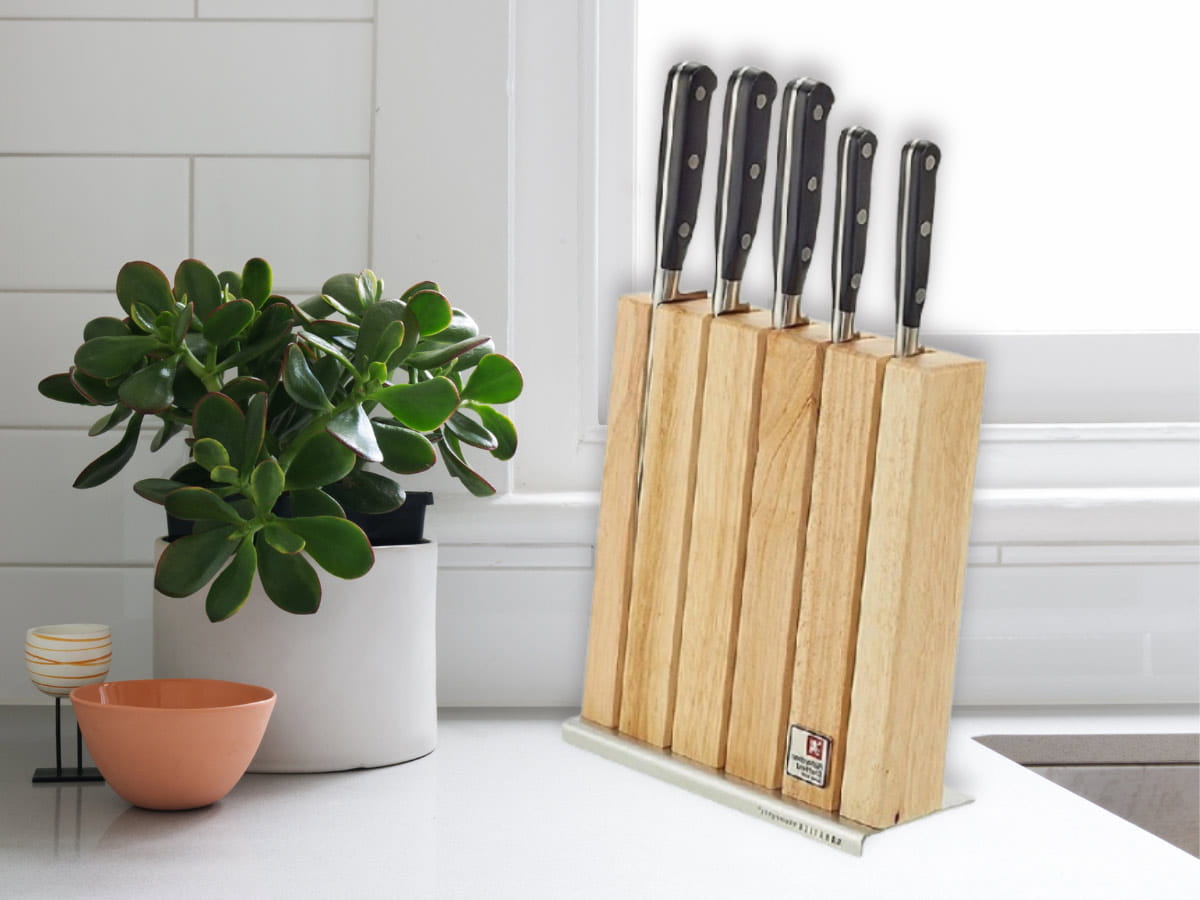 - duży, stabilny blok wykonano z drewna naturalnego, ułatwia porządek i organizację w kuchni, blok zawiera wewątrz listwy magnetyczne utrzymujące noże