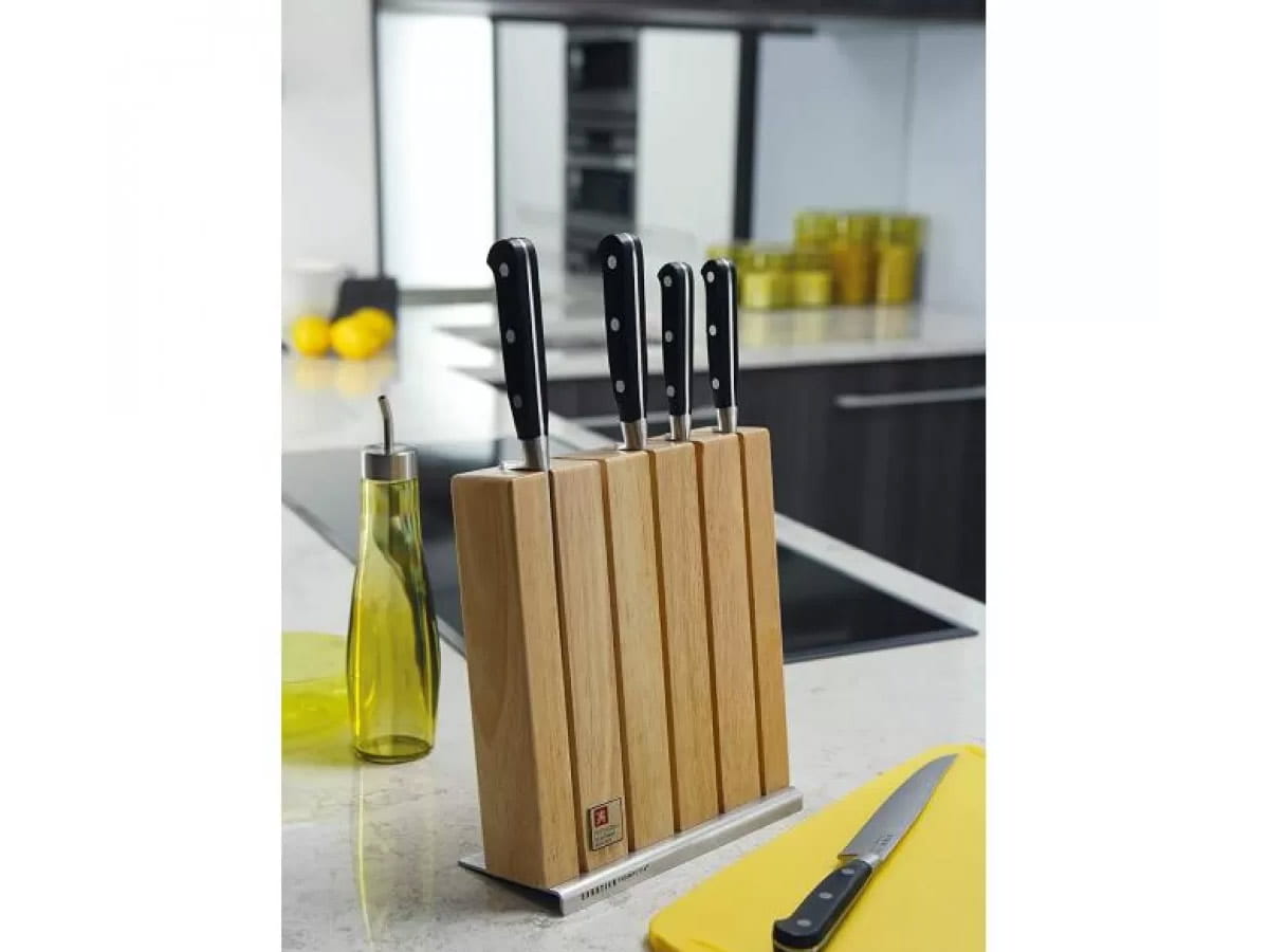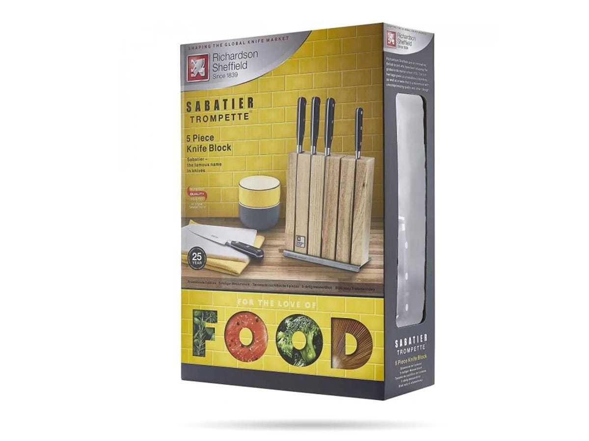 Zestaw noży w bloku Richardson Sheffield. Sabatier Trompette to noże dla profesjonalistów - niezawodne, wyjątkowo ostre, solidne i trwałe. Ergonomiczne, nitowane rękojeści pozwalają na precyzyjną pracę. Noże osadzone w drewnianym bloku. Doskonałe noże do gastronomii i do domu.
