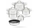 Kompletny zestaw garnków o różnej pojemności. Gładkie, stalowe garnki wykończone połyskiem. Szerokie, wygodne uchwyty. Szklane, dopasowane pokrywki z odpowietrznikami pary. Idealny prezent na nowe mieszkanie.