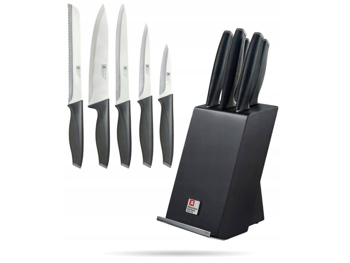 Zalety produktu: praktyczny, solidny zestaw noży przydatnych w każdej kuchni ostrza noży wykonane z wysokiej jakości stali nierdzewnej wygodna rękojeść noża z antypoślizgową powłoką solidny, drewniany blok na miękkich nóżkach, zapewniających stabilność praktyczna podstawka na telefon, tablet lub książkę kucharską zestaw noży zawiera nóż do pieczywa, nóż do mięsa, nóż szefa kuchni, uniwersalny nóż kuchenny i mały nóż do obierania i skrobania warzyw i owoców oryginalne opakowanie - zestaw noży to świetny pomysł na praktyczny prezent