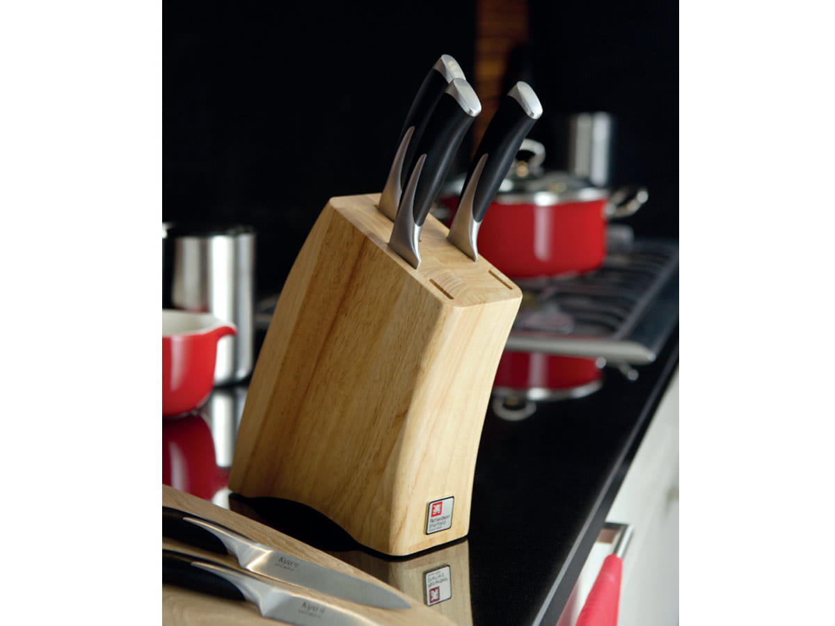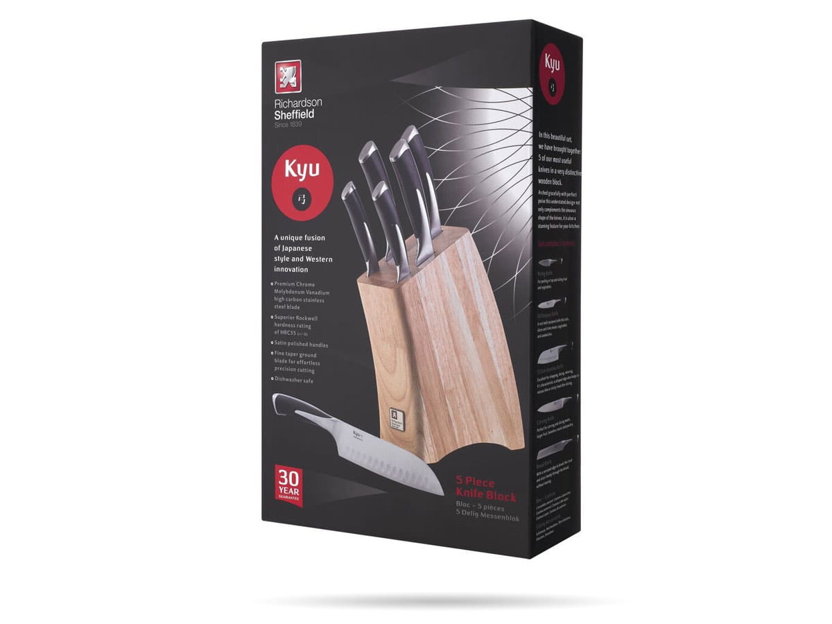 Zestaw noży w bloku Richardson Sheffield. Kyu to nawiązanie do tradycyjnego, japońskiego łuku. Noże z wysokiej jakości stali nierdzewnej chromowo-molibdenowo-wanadowej - niezawodne, wyjątkowo ostre, solidne i trwałe. Ergonomiczne, stalowe rękojeści pozwalają na precyzyjną pracę. Noże osadzone w drewnianym bloku. Unikatowy i elegancki zestaw, który wpasuje się w każdą kuchnię.